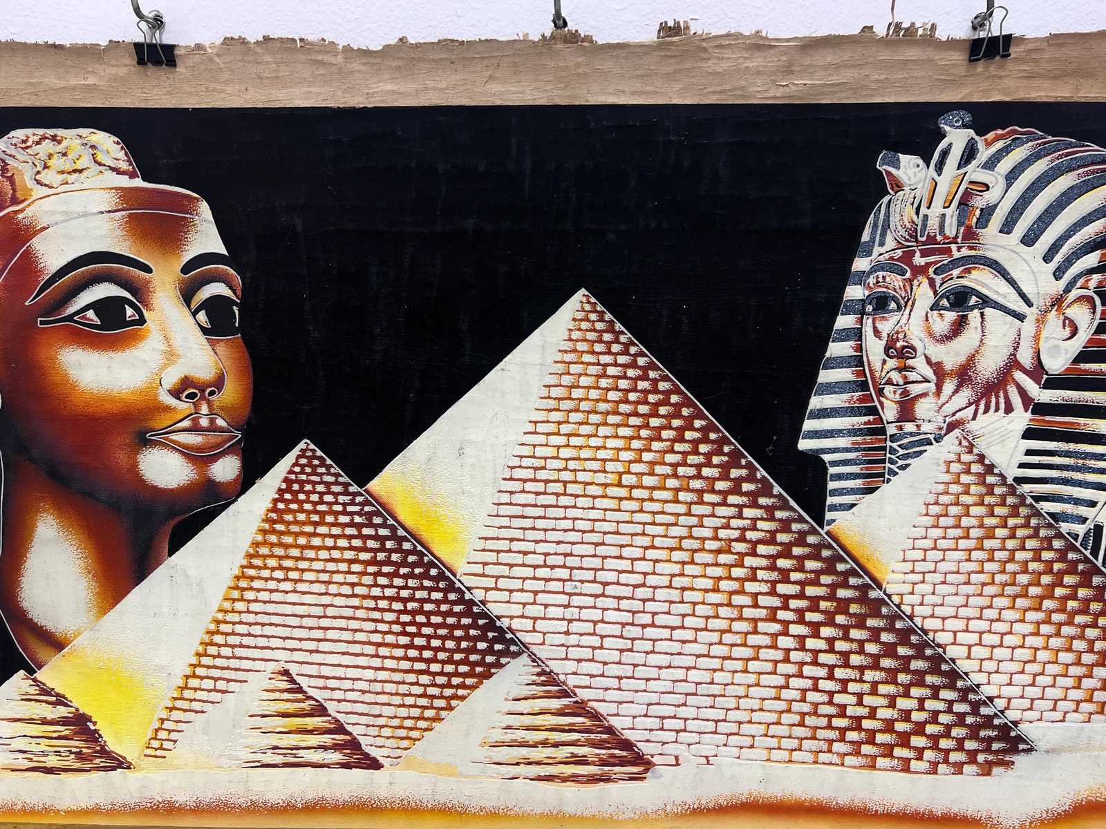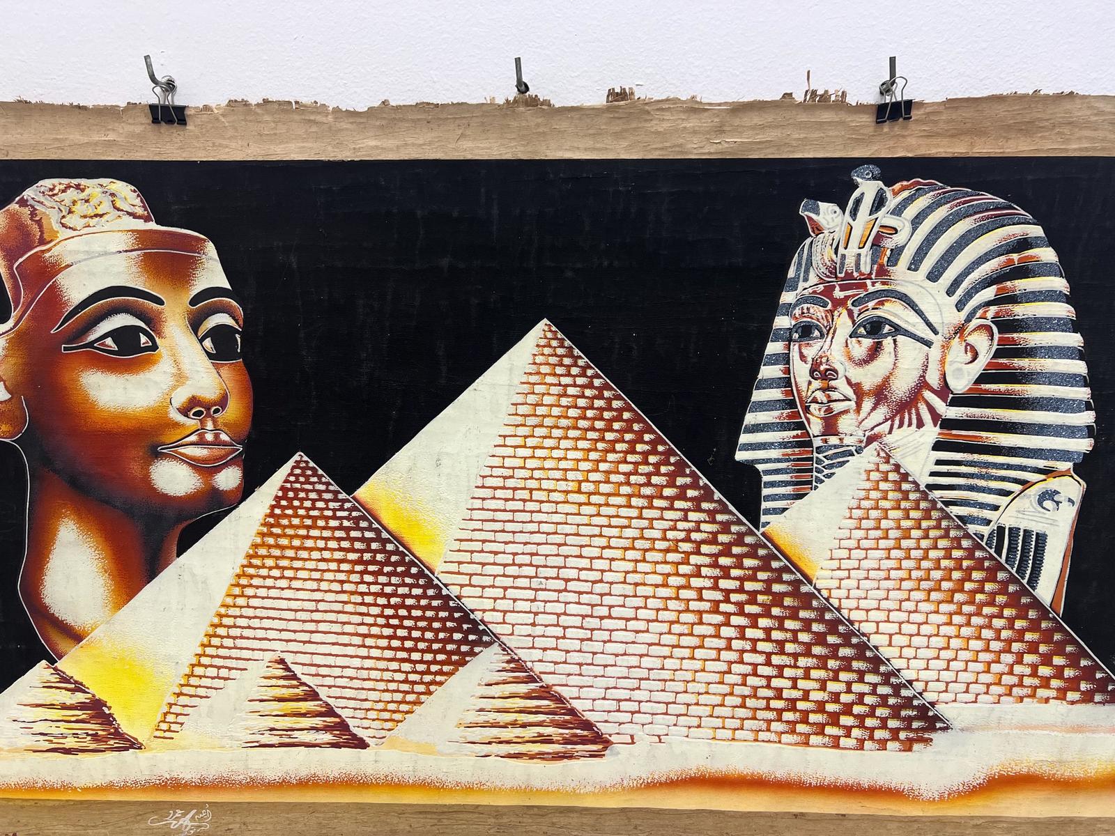 On one side, you?ll find a beautifully rendered Egyptian figure in profile, adorned with traditional headgear and accessories, capturing the elegance and splendor of this ancient civilization. To the right, majestic pyramids rise in the distance, with a picturesque procession of camels and riders, evoking the spirit of a time long past.