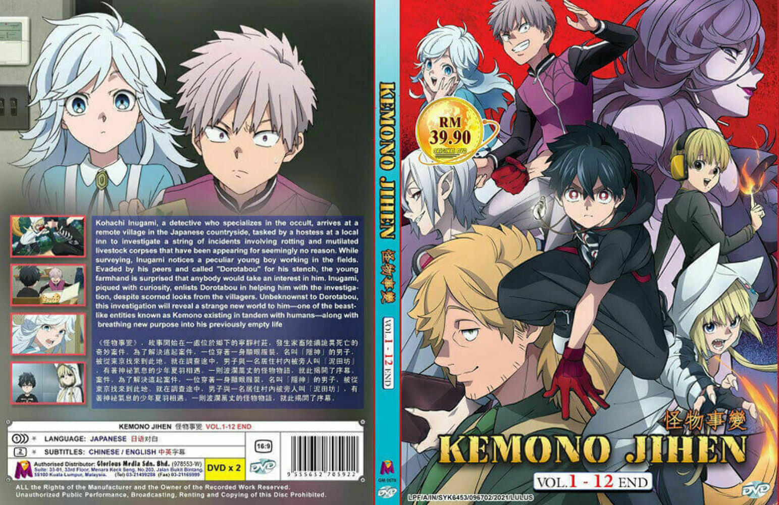 body { font-family: "Market Sans", Arial, sans-serif; } For detail of this set please view below only, and also to tell if this set has english or Japanese audio view below and check out the listing photo back side. If it shows as (Japanese / English Version means it has English audio but if it only shows Japanese Version no English Audio)All our set has at less English Subtitles if only Japanese audio. This set is all regions. KEMONO JIHEN VOL.1-12 END DVD Title Name ???? No of Disc 2 Disc (12 Episodes) Version Japanese Subtitles Chinese / English Format DVD / NTSC All Region Code (16:9 STORY : Kohachi Inugami, a detective who specializes in the occult, arrives at a remote village in the Japanese countryside, tasked by a hostess at a local inn to investigate a string of incidents involving rotting and mutilated livestock corpses that have been appearing for seemingly no reason. While surveying, Inugami notices a peculiar young boy working in the fields. Evaded by his peers and called "Dorotabou" for his stench, the young farmhand is surprised that anybody would take an interest in him.Inugami, piqued with curiosity, enlists Dorotabou in helping him with the investigation, despite scorned looks from the villagers. Unbeknownst to Dorotabou, this investigation will reveal a strange new world to him?one of the beast-like entities known as Kemono existing in tandem with humans?along with breathing new purpose into his previously empty life.??????, ????????????????, ????????????????????????, ??????????, ?????????, ????????????????, ??????????????????, ?????????????????????????, ???????? We Only Sell Original/Genuine DVDs. All DVDs I'm selling are from Licensed Publisher in Malaysia. All DVDs come with Original Sealed Authenticated Sticker / Hologram by Malaysia Censorship Board. ALL PACKAGE WILL BE SHIP OUT FROM USA CA SAN DIEGO AREA OCEANSIDE, SAN MARCOS. THIS MEAN WITH IN USA YOU SHOULD RECEIVE THE PACKAGE WITH IN 4-6 BUSINESS DAY AFTER SHIP OUT. We Only Sell Original/Genuine DVDs. All DVDs I'm selling are from Licensed Publisher in Malaysia. All our products are All region so it will play any dvd player in the world Any problem please contact us first so we can speed up taking care of you.