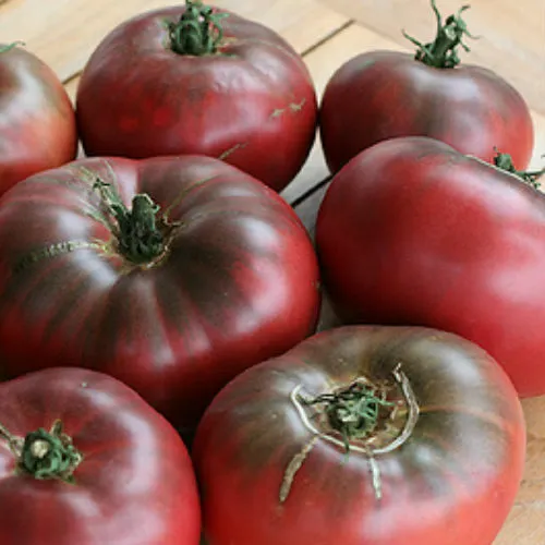 Cherokee Purple Tomatoes are classified as black tomatoes. They are dusky pink-purple with dark shoulders. The flesh of Cherokee Purple Tomatoes is a deep red color mixed in with purple hues, which is very attractive sliced on a plate. Cherokee Purple Tomatoes consistently rank very high in taste tests. They combine sweetness and juiciness with a strong tomato tang. Cherokee Purple Tomatoes originated in Tennessee and is thought to have come from Cherokee gardeners. Beefsteak in style with green shoulders, they boast a dense, juicy texture with just the right amount of sweetness. This variety grows well in most regions of the U.S.