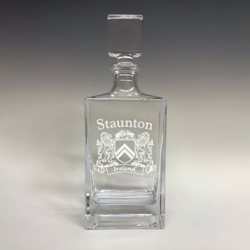 Product description: Staunton Irish coat of arms deluxe whiskey decanter with coat of arms - sand etched. Celebrate heritage and tradition with our stunning Whiskey Decanter adorned with your Irish Coat of Arms. This timeless piece adds elegance to any setting, making it a perfect gift for special occasions. Expertly crafted from durable, heavy liquor glass, it features a substantial 28.5 oz capacity and a sleek glass stopper lid. The intricate sand-etched design ensures lasting beauty, elevating your whiskey experience with sophistication and charm. Perfect for weddings, groomsmen, reunions, or any special occasion. Authentic Irish coats of arm with over 25 years of heraldry research. Heavy liquor glass decanter and glass stopper lid. Size - 9 1/4"(H) x 4 1/2"(L) x 2 1/2" (W). High quality permanent sand-etching and packaged in a sturdy black gift box with heavy EVA foam for protection.
