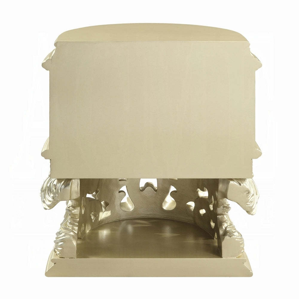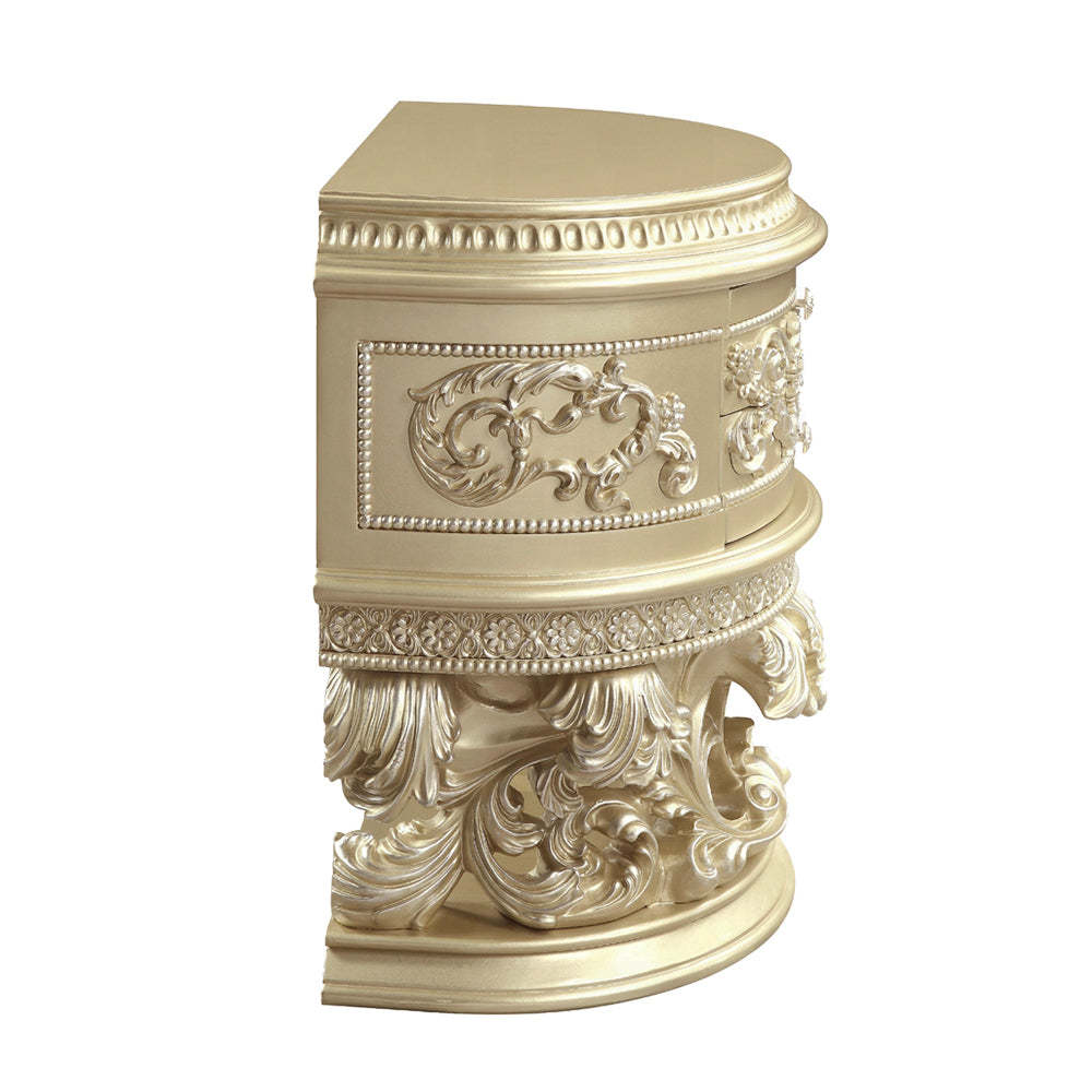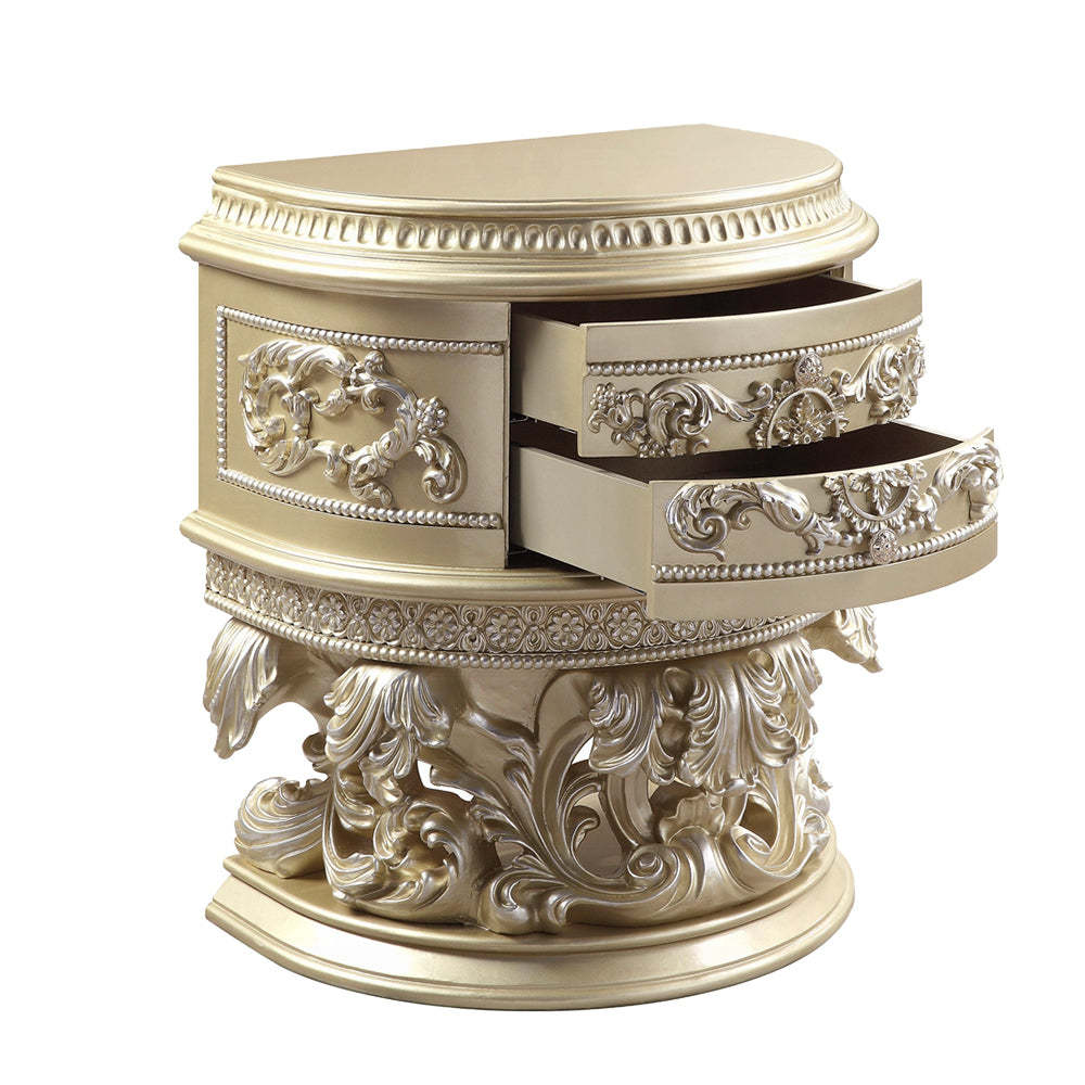 Upgrade your interior space with an essential accessory that is the perfect companion for giving your bedside or sofa a boost of refinement. With a durable wood frame and finished with opulent scrollwork, this nightstand offers incredible structure and stunning looks for your home. It gives your living space an incredible design with its ornate accents and two drawers for storage. Champagne gold tone lends a sleek finishing touch to the furniture.