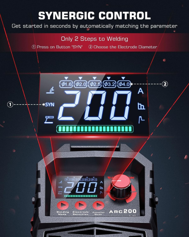 Synergic Control: Only 2 steps to start your welding journey. Step 1: Press on the button "SYN. Step 2: Choose the electrode diameter. No more tedious setting.