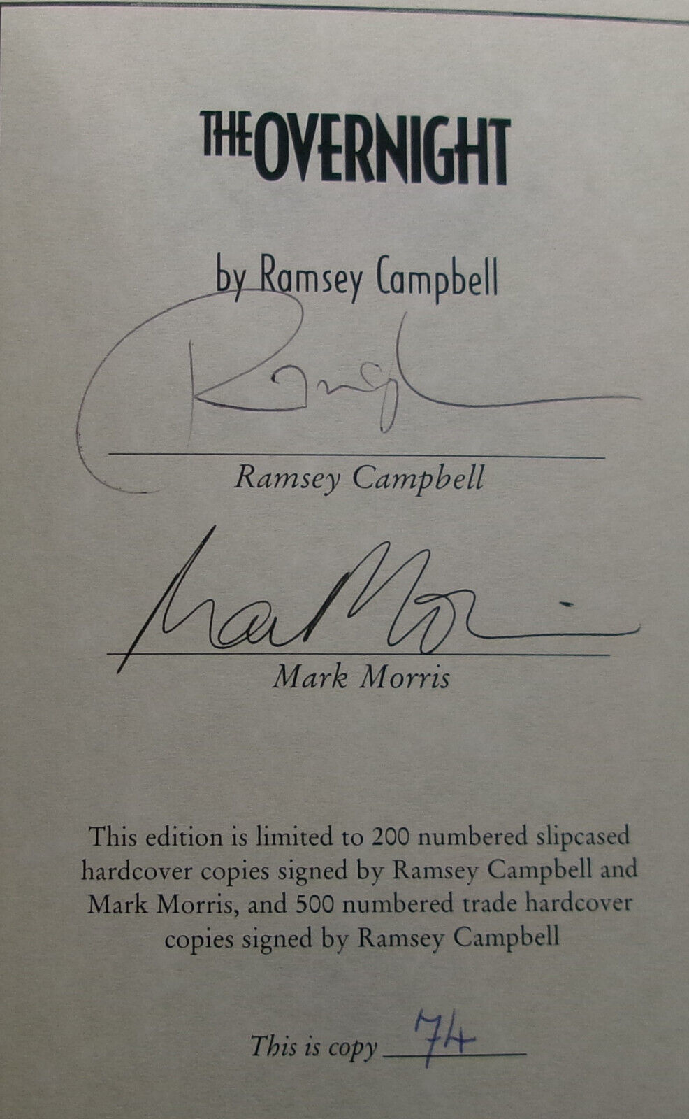 Limited to two-hundred hand-numbered, slip-cased copies SIGNED by Ramsey Campbell, five-time World Fantasy and nine-time Bram Stoker Awards winning author, And SIGNED by two-time BFA Awards winning horror author and here introducer, Mark Morris to the limitation page.