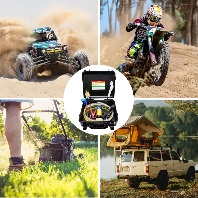 A 12V powered transfer pump that quickly delivers gasoline or diesel, delivers 80-85gallons of fluid per hour. (The delivery speed is related to the delivery height and liquid viscosity, and the fuel filter may reduce the delivery speed slightly)