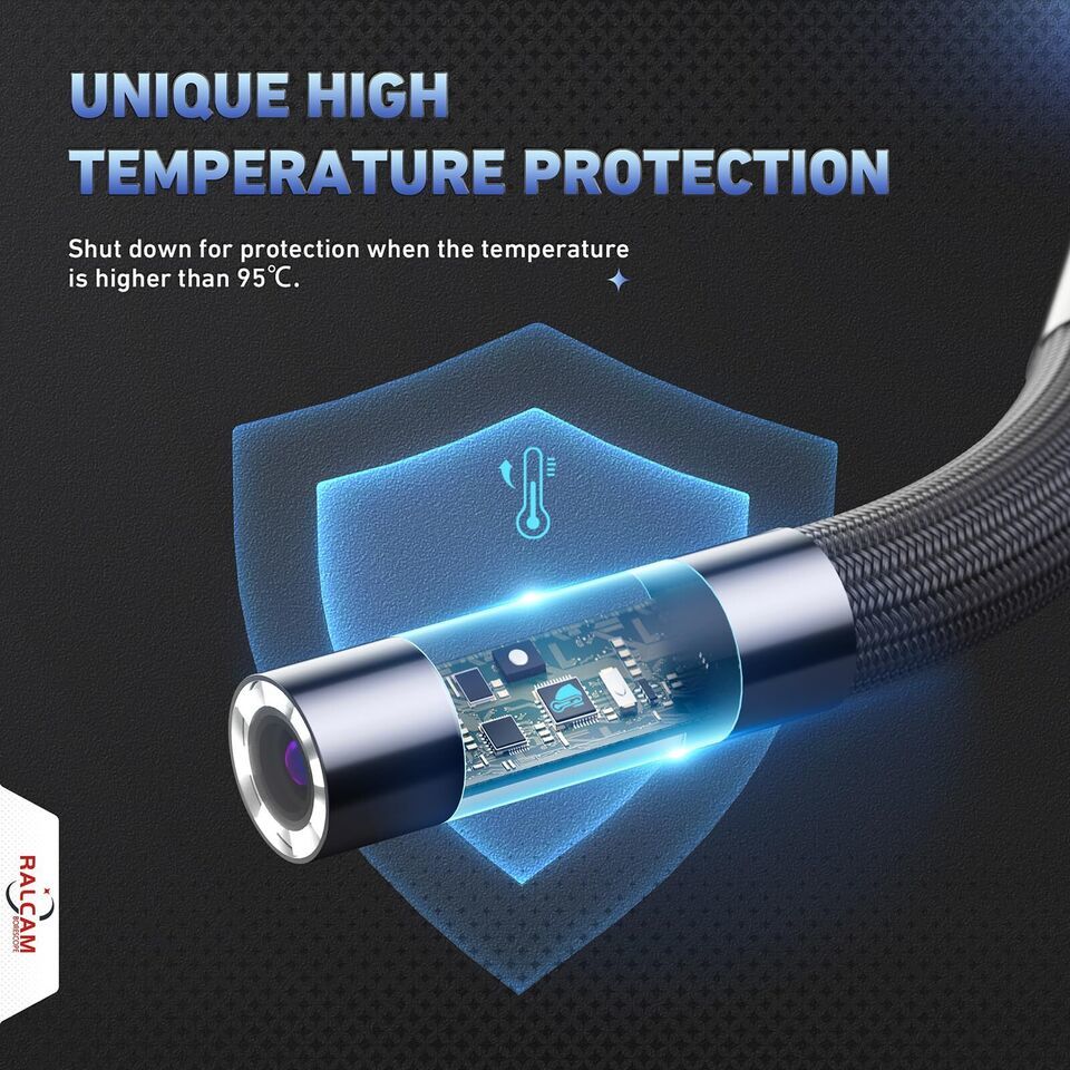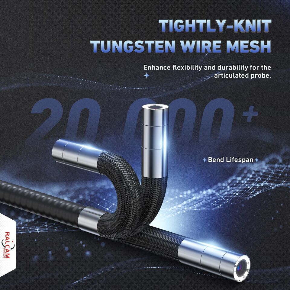 ??4-Way 360 Articulating Borescope?Professional 4-way 360 degrees all view steering inspection camera, navigate through tight spaces effortlessly thanks to the flexible and articulate probe. Probe bends and rotates, allowing you to access even the most challenging areas while maintaining crystal-clear visibility,no dead spots, and it can be locked at any desired angle for detailed inspection, instead of manually rotating or twisting the cable. Ideal for beginners and experts alike ??6.2mm Durable Industrial Camera?Ralcam superb 6.2mm borescope envisions the hard-to-reach places exquisite clearly for non-destructive testing. The 1080P borescope camera always delivers sharp images and videos with true to life colors. Easily restore the real scene, every picture is full of details. 6 high-visibility LEDs surrounding the probe ensure a clear view in wet or dark areas. Adjustable brightness meets different needs for the clearest image ??Convenient Easy Operation?Effortlessly start your inspections with our ready-to-use camera?no phone data, WiFi, or app required. Capture and record in JPG and AVI formats with the built-in 16GB MicroSD card. Enhance your review process with voice memo recording using the integrated microphone and speaker. This compact and efficient inspection tool seamlessly combines functionality with a user-friendly design, ensuring a hassle-free experience for all your inspection needs ??Excellent Inspection Experience?The ergonomic handle plus joystick makes it easy for one person to hold the monitor with one hand and control the cable with the other, make it much more relaxing to use, maximumed your work efficiency. This F606B borescope camera is perfect for capture the most critical details every time, easily capture high-resolution images and videos to analyze and share your findings, perfect for documenting repairs or assessments ??Wide Application?The engine borescope with movable head is specially suitable for mechanical inspection, car or truck repair, plumbing fixes, electrical installs, house DIY, ceiling, wall upgrades, chimney cleaning, air conditioning maintenance, and more. The endoscope camera is a practical addition to the toolbox of auto mechanics, HVAC technicians, plumbers, and a surprise for father or husband on birthdays, Father's Day, Valentine's Day or Christmas