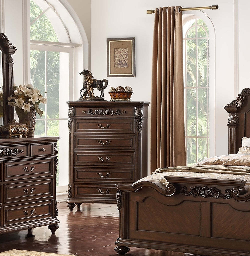 Description :- Personalize your side of the bed with this chest of drawers. Supported on turned legs, this chest provides an organized storage to your essentials. Listing Includes - 1pc Chest Of Drawers Only. Dimensions - 38" x 17" x 53"H Materials - Pine / Particle Board / MDF / Cherry Veneer / Plywood / Poly Simple Assembly requires.