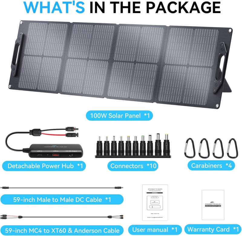?PACKAGE CONTENT CUSTOMER SERVICE?Package List: 100W Solar Panel*1, Detachable Power Hub*1, 59-in DC cable*1, 59-in MC4 to XT60 Anderson Cable*1, Carabiners*4, DC Adapter*10, Manual*1.We promise 18 months warranty, if there's any problem about the product please contact us and we will reply to you in 24 hours.
