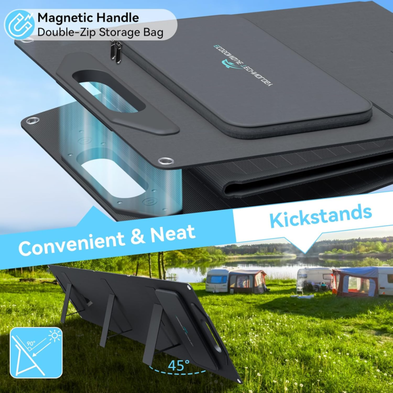 ?ADJUSTABLE KICKSTAND MAGNETIC HANDLE?Our folding solar panel is easy to use. 3 kickstands help you to adjust angle of sunlight, and with magnetic handle you can pick up the 4-fold usb solar panel anytime without organization. It would be a great helper in RV trip, camping or off-grid living.