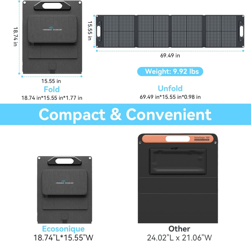 ?ETFE MONOCRYSTALLINE CELL?These camping solar panels integrate ETFE and monocrystalline solar cell into one piece, achieving 23.5% conversion rate and 95% light transmittance. Plus IP67 waterproof level, the solar panel charger are highly efficient and durable.