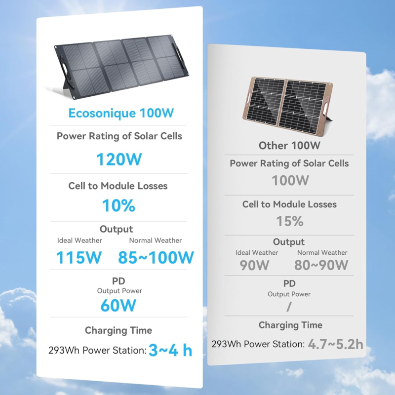 ?EQUIPPED 120W HIGHER-POWER SOLAR CELLS ?To provide a better user experience, the actual design power of our solar panel is 120W, which is 20% higher than the rated power. The actual output power of solar powered charger is affected by encapsulation and weather, so most solar panels on the market do not reach the rated power.