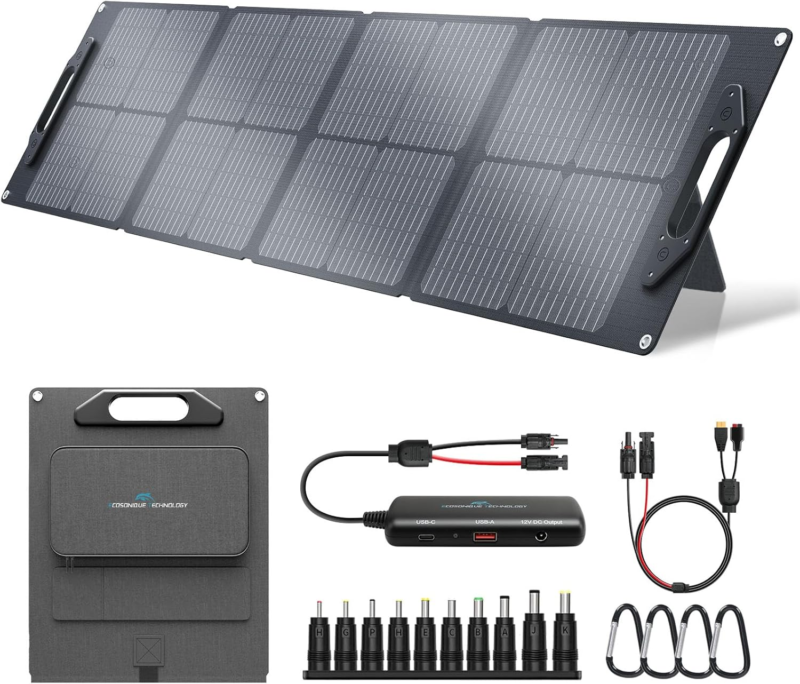 ?22V MC4 / 12V DC / QC3.0 USB A C?This 100 watt solar panel has 4 ports including MC4 cable, USB-C, USB-A and a DC output, and also comes with MC4 to XT60/Anderson cable, being compatible with all kinds of devices as well as power stations, and able to meet your needs in defferent occasions.