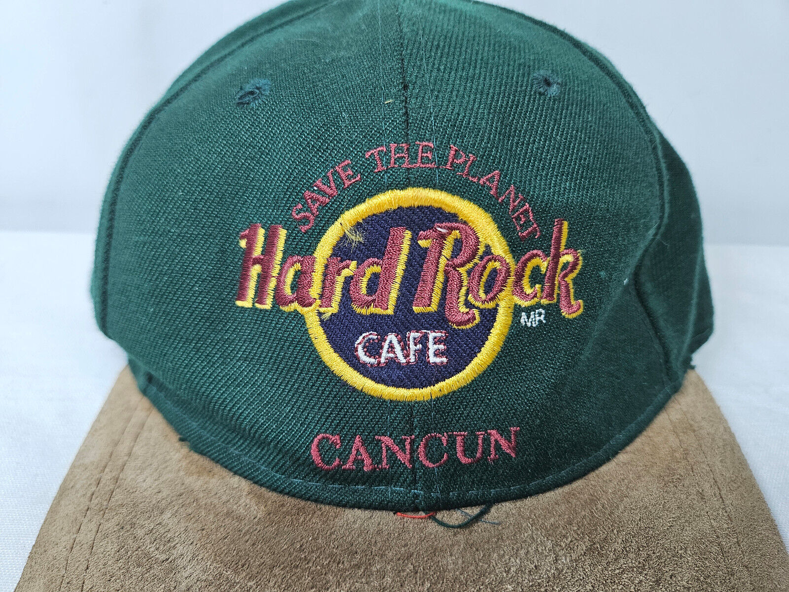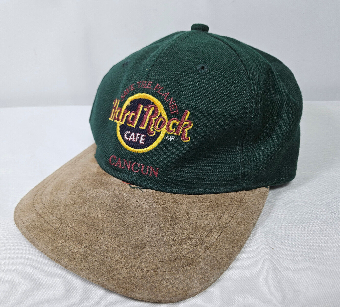 Vtg Hard Rock Cafe Cancun Hat Cap Green Tan Save the Planet Love All Serve All