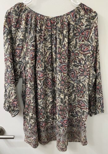 Chaps Blouse Womens Size 1X Paisley Print 3/4 Sleeve keyhole Red Blue beige EUC