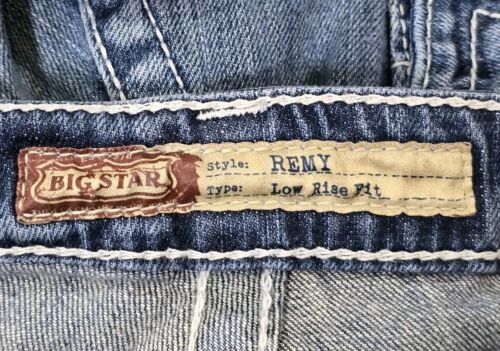 Labeled 34 measures 37x32. Please see photos. Craft a classic look with these Big Star Remy Boot Cut Jeans, featuring a regular fit in a size 34 with a dark wash denim that provides a versatile, vintage aesthetic. Designed with a mid-rise waist and a 32-inch inseam, these jeans offer a comfortable and flattering silhouette for everyday wear. The traditional 5-pocket design, complete with distinctive logo accents and button details, exemplifies casual sophistication.