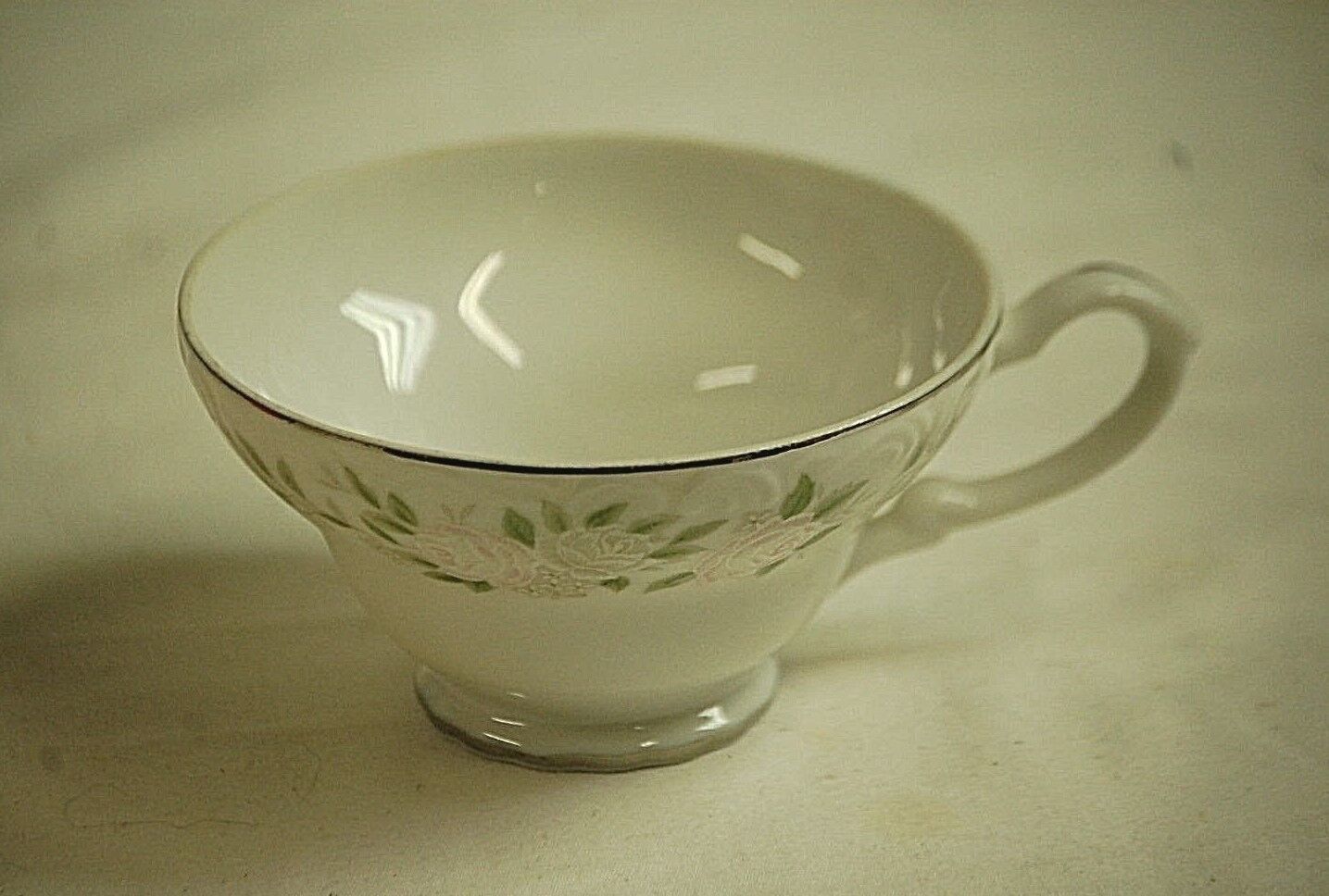 White with Pink Roses on Rim Green Leaves