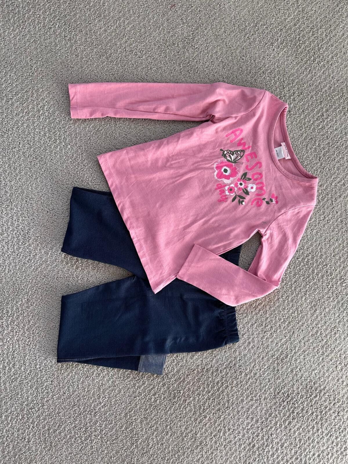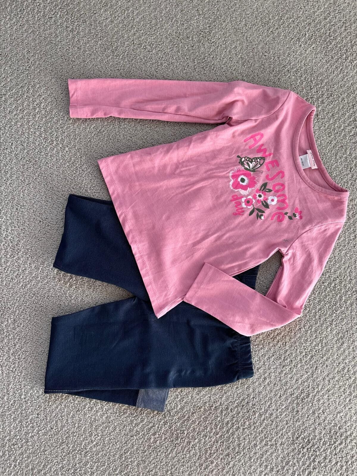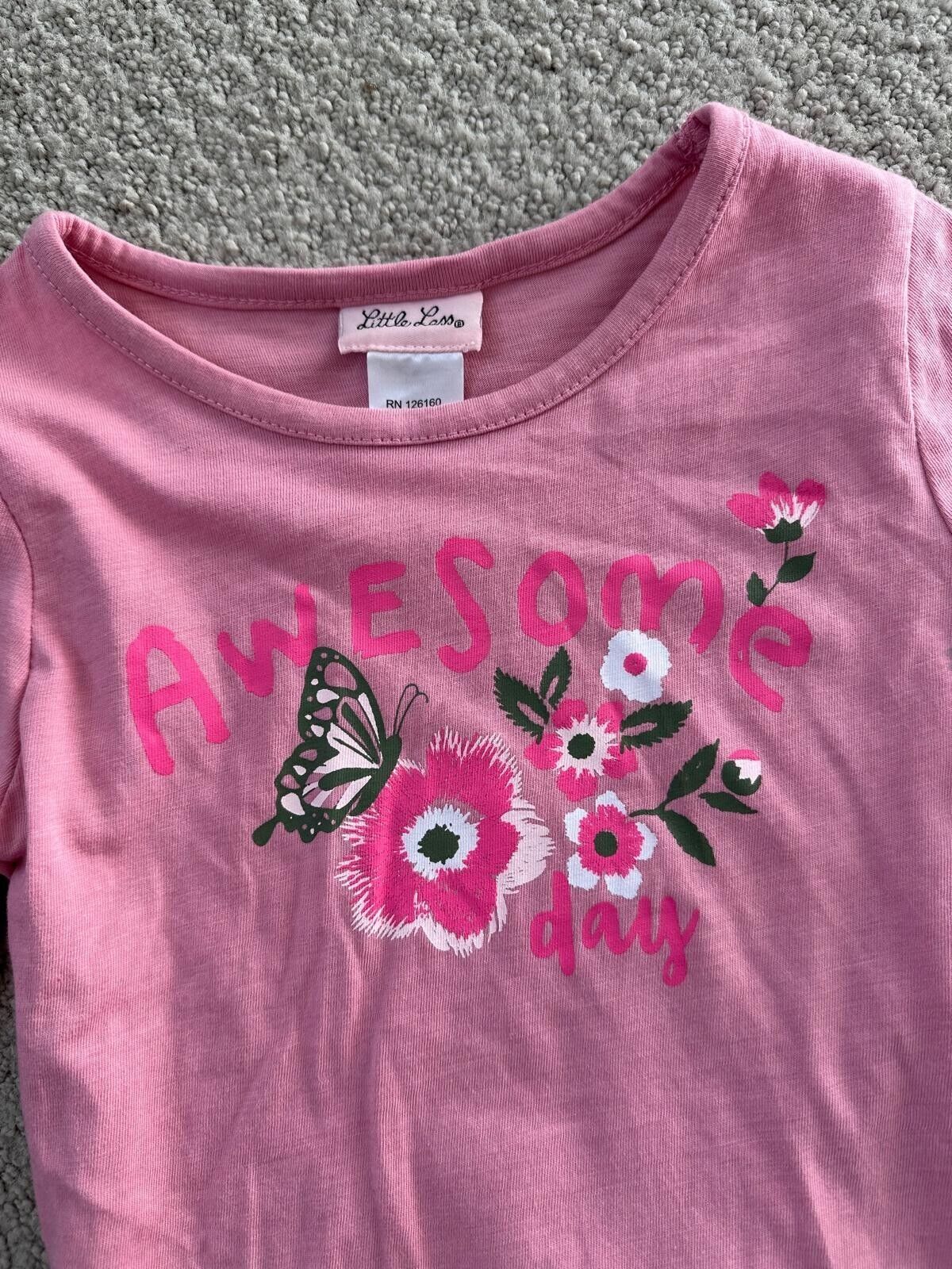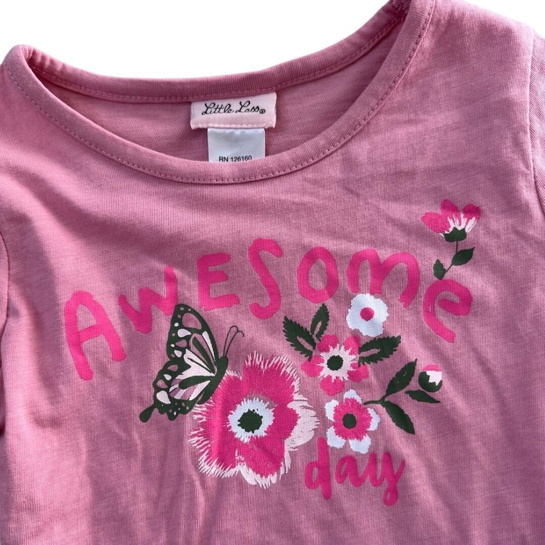 Top: Pink long-sleeve shirt with "Awesome Day" graphic, floral, and butterfly details.