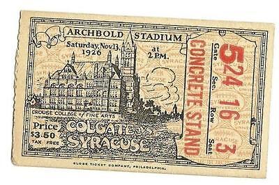 For Sale is a rare and hard to find vintage 1926 College Football ticket stub Colgate Syracuse. Its In VG Condition with Some Minor Handling wear as pictured we have included one of the front and back. Please ask Any and All Questions prior to purchasing. Nice addition to any College Bowl Collection. Fast Same or Next day shipping with Free Delivery Confirmation within the U.S. Payment Due within 7 days of purchase (if you need more time please let us know In advance) we love to combine shipping is always a Yes and Most of the time Additional Items Ship for free.