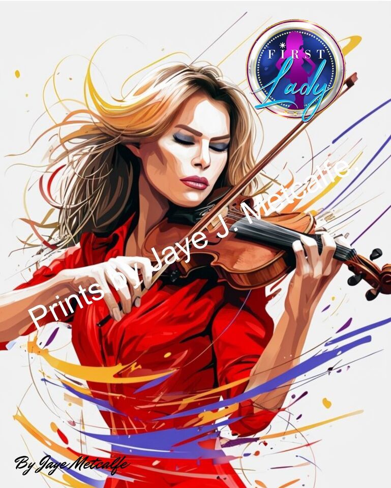 The "Melania Trump Musical Art Set of 2" features artworks by artist Jaye Metcalfe, each measuring 11x14 inches and printed on gloss paper. The prints are signed by the artist and come as a limited edition set. The abstract style pieces showcase a musical theme related to Donald Trump, originating from Florida and produced in the United States between 2020 and now. They are unframed, making them versatile for display and collection.