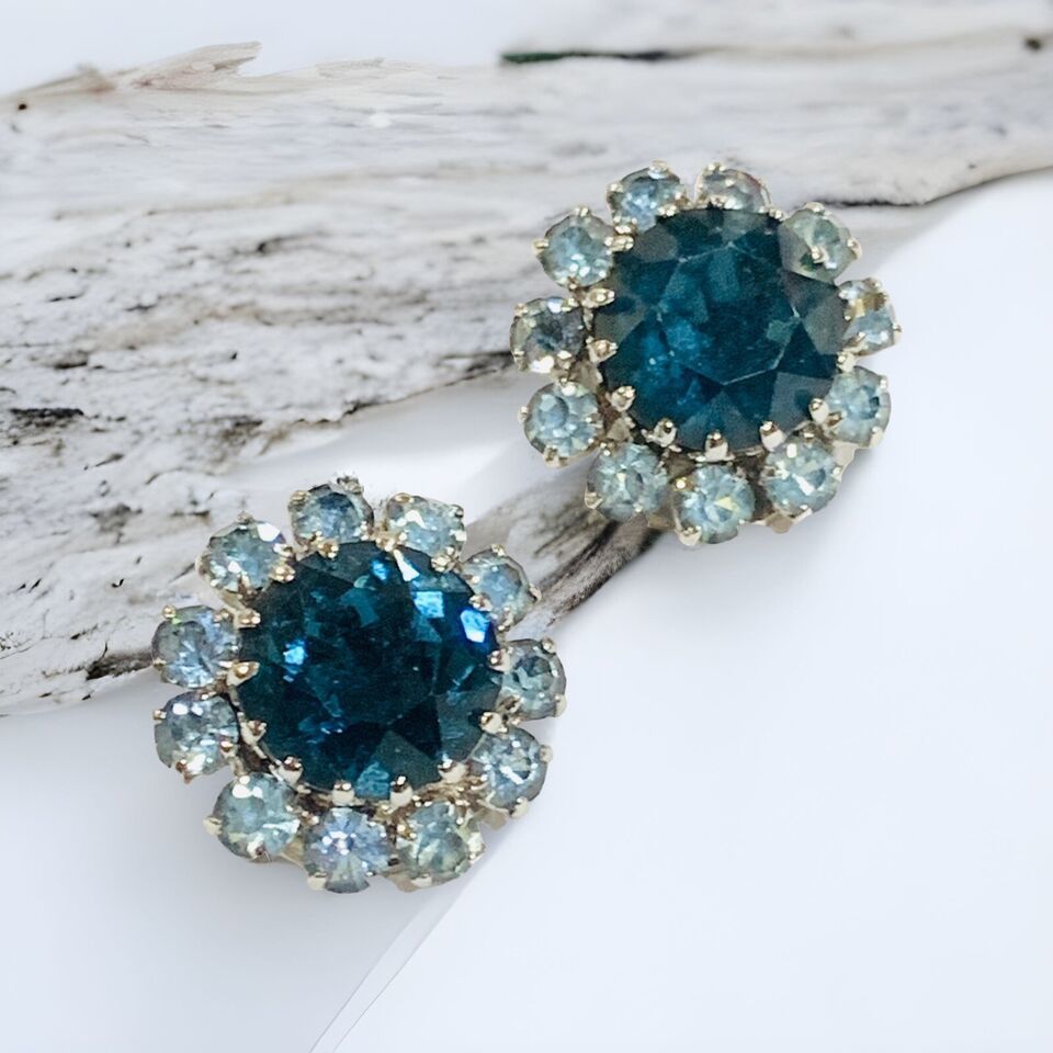 Vtg Multicolor Blue Purple Crystal Rhinestone Flower Clip Earrings Austria Made