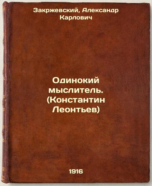Short description: In Russian. Zakrzhevsky, Alexander Karlovich. A lone thinker. (Konstantin Leontev). Kyiv: Journal of Christian Thought, 1916. Odinokiy myslitel'. (Konstantin Leont'ev). In Russian /The lone thinker. (Konstantin Leontev). The image is provided for reference only. It may reflect condition of one of the available copies or only help in identifying the edition. Please feel free to contact us for a detailed description of the copies available. SKU4210290