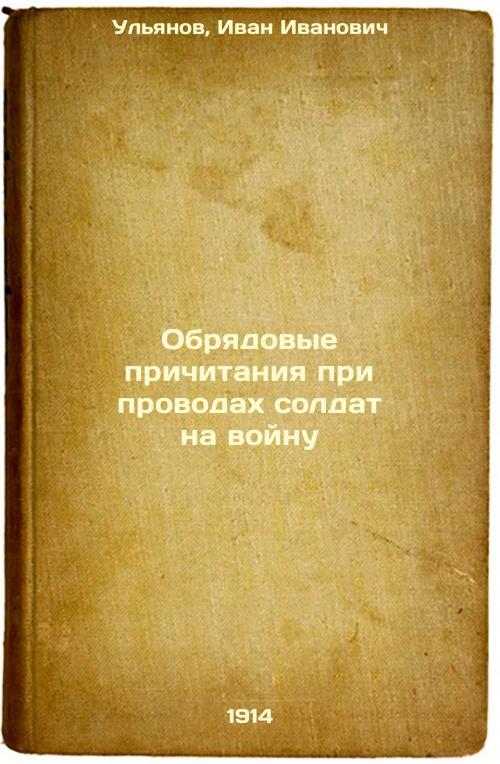 Short description: In Russian. Ulyanov, Ivan Ivanovich. The rituals of sending soldiers to war. Petrograd: type. Moscow, 1914. Please feel free to contact us for a detailed description of the copies available. SKU4200807