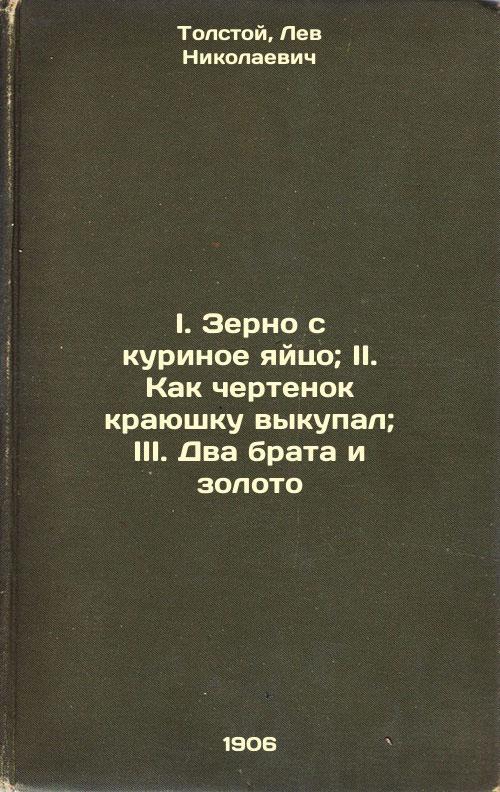 Short description: In Russian. Tolstoy, Lev Nikolaevich. I. Grain with a chicken egg. II. How the devil redeemed the krai. III. Two brothers and gold. Moscow: Intermediary, 1906. I. Zerno s kurinoe yaytso. II. Kak chertenok krayushku vykupal. III. Dva brata i zoloto. In Russian /I. Grain with a Chicken Egg. II. How the Devil redeemed the land. III. Two brothers and gold. The image is provided for reference only. It may reflect condition of one of the available copies or only help in identifying the edition. Please feel free to contact us for a detailed description of the copies available. SKU3739479