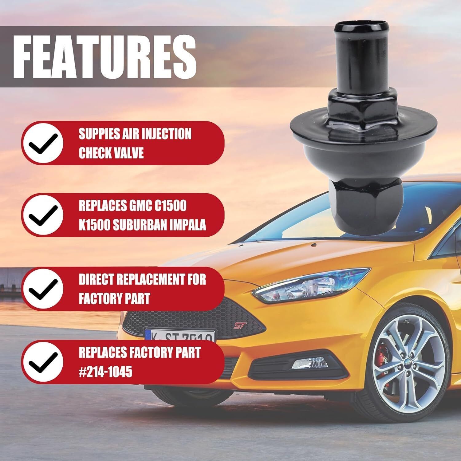 AIR INJECTION CHECK VALVE - Air Injection Check Valve prevents exhaust gases from flowing back through the air injection system, and is a GM-recommended replacement for your vehicle's original component. This equipment secondary air injection check valve has been manufactured to fit your specific GM vehicle, providing the same performance, durability, and service life you expect from General Motors. COMPATIBLE WITH FOLLOWING VEHICLES - 82-85 Chevrolet C30, 82-86 Chevrolet G10, 82-86 Chevrolet G20, 82-83 Chevrolet G30, 82-84 Chevrolet K10, 82-84 Chevrolet K10 Suburban, 82-85 Chevrolet K20, 82-85 Chevrolet K20 Suburban, 82-85 Chevrolet K30, 82-84 Chevrolet K5 Blazer, 82-87 Chevrolet P20, 82-87 Chevrolet P30, 82-84 GMC C1500, 82-84 GMC C1500 Suburban, 82-85 GMC C2500, 82-85 GMC C2500 Suburban, 82-85 GMC C3500, 82-86 GMC G1500, 82-86 GMC G2500, 82-83 GMC G3500, 82-84 GMC Jimmy, 82-84 GMC K1500 COMPATIBLE WITH FOLLOWING VEHICLES - 82-85 GMC K3500, 82-87 GMC P2500, 82-87 GMC P3500, 85-88 Chevrolet G30, 85-88 GMC G3500, 86-87 Chevrolet Corvette, 90-04 Chevrolet Corvette, 93-96 Cadillac Commercial Chassis, 93-96 Cadillac Fleetwood, 93-02 Chevrolet Camaro, 93-02 Pontiac Firebird, 94-96 Buick Commercial Chassis, 94-96 Buick Roadmaster, 94-96 Chevrolet Caprice, 95-96 Chevrolet Impala, 01-03 Saturn L200, 01-03 Saturn LW200. Please check the fitment in the product description below. REPLACE PART NUMBERS -214-1045, 22040805. Please check the part numbers whether it suits your vehicle before purchasing.Offering the quality, reliability, and durability of GM OE. Manufactured to GM OE specification for fit, form, and function. BUY WITH CONFIDENCE - All products have been 100% tested before delivery, If you have any problem with our Air Injection Check Valve for Chevy Impala , feel free to contact us, we will sort things out together.