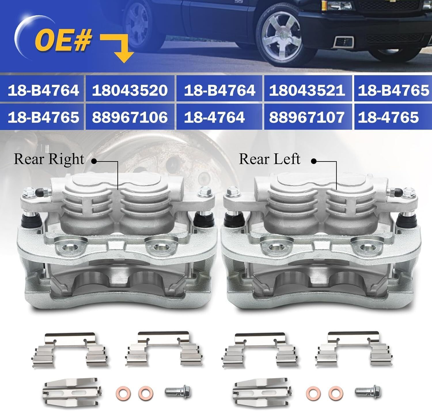 ?Compatible with: For 2002-2006 Cadillac Escalade?2003-2006 Cadillac Escalade ESV?2002-2006 Cadillac Escalade EXT. For 2002-2006 Chevy Avalanche 1500?2001-2007 Chevy Silverado 1500? 2007 Chevy Silverado 1500 Classic?2003 2005 Chevy Silverado 1500 HD?2000-2006 Chevy Suburban 1500?2000-2006 Chevy Tahoe. For 2001-2007 GMC Sierra 1500?2003 2005 GMC Sierra 1500 HD?2000-2006 GMC Yukon/Yukon XL 1500. For 1999-2000 Ford F-150. Please check the second main picture to confirm rear brake caliper whether compatible with your car. ?Safety Design: Pressure tested to ensure safe and effective braking, in order to slow down or safely stop your car when you push the brake pedal. ?High-quality: Made of high-quality heavy duty carbon steel, galvanized surface to prevent rusting, multiple tests has been taken to ensure quality and durability. ?OE# 18-B4764 18-B4765. Replace OE# 18043520, 88967106, 18-B4764, 18-4764, 18043521, 88967107, 18-B4765, 18-4765. Package included: 18-B4764 Rear Left Brake Caliper x1, 8-B4765 Rear Right Brake Caliper. Not included instruction manual, easy to install. ?After-Sales Service: We offer 24 hours customer service and 1 year product service, If you are encounter product installation, product quality and other problems, please feel free to contact us.