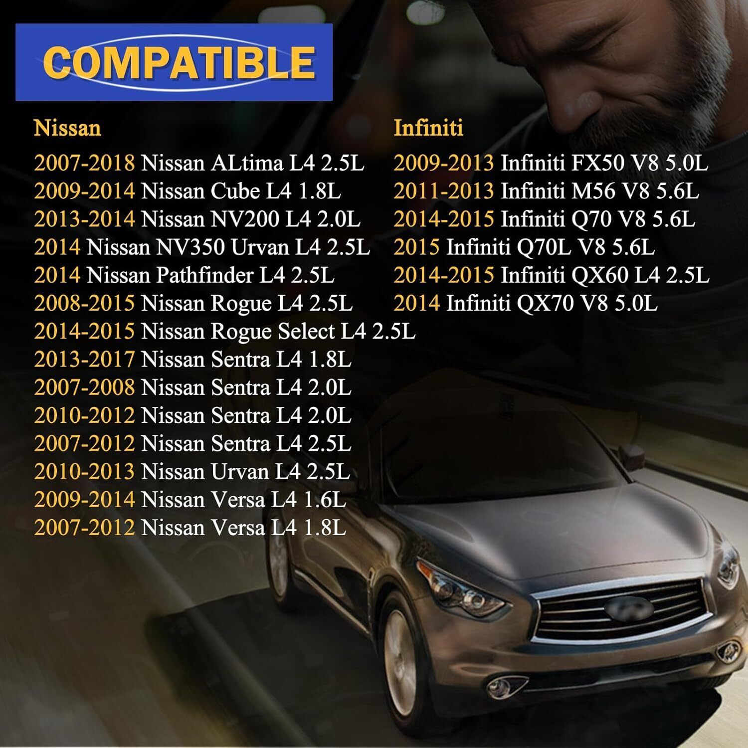 *For Infiniti: 09-13 FX50 5.0L?11-13 M56 5.6L?14-15 Q70 5.6L?14-15 QX60 2.5L?2014 Infiniti QX70 5.0L?2015 Infiniti Q70L 5.6L.