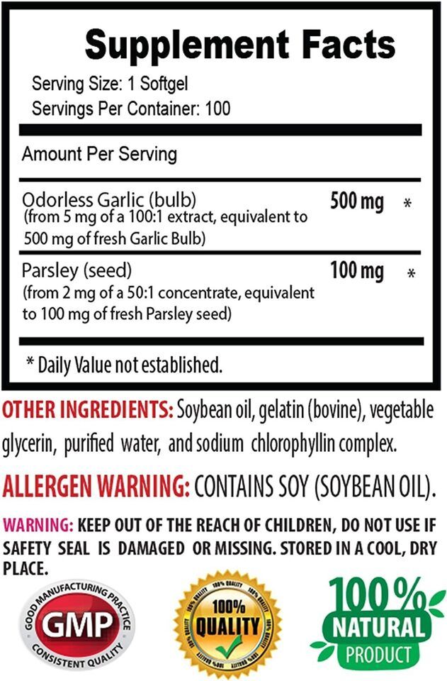 GARLIC AND PARSLEY: Garlic is widely recognized for its ability to boost your immune support. One study found that allicin, an active component of freshly crushed garlic, has many body's natural defense properties. Our Odorless Garlic and Parsley formula is formulated in quick-absorb softgels for easy-take. This garlic and parsley supplement comes in special softgels that not only help prevent the bad odor but also the strong after-taste.*