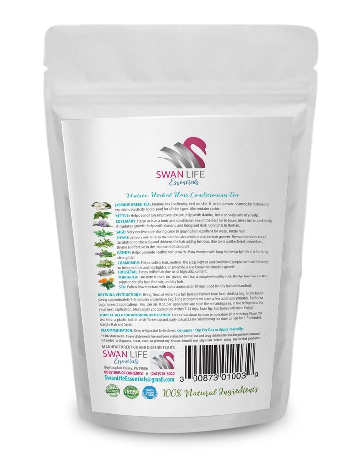 OUR HERBAL HAIR TEA FORMULA: Our herbal hair conditioning tea is made with premium-quality natural ingredients (JASMINE, NETTLE, ROSEMARY, SAGE, THYME, CATNIP, CHAMOMILE, HORSETAIL, MARIGOLD, ST6), and exudes the distinct flavor and aroma.