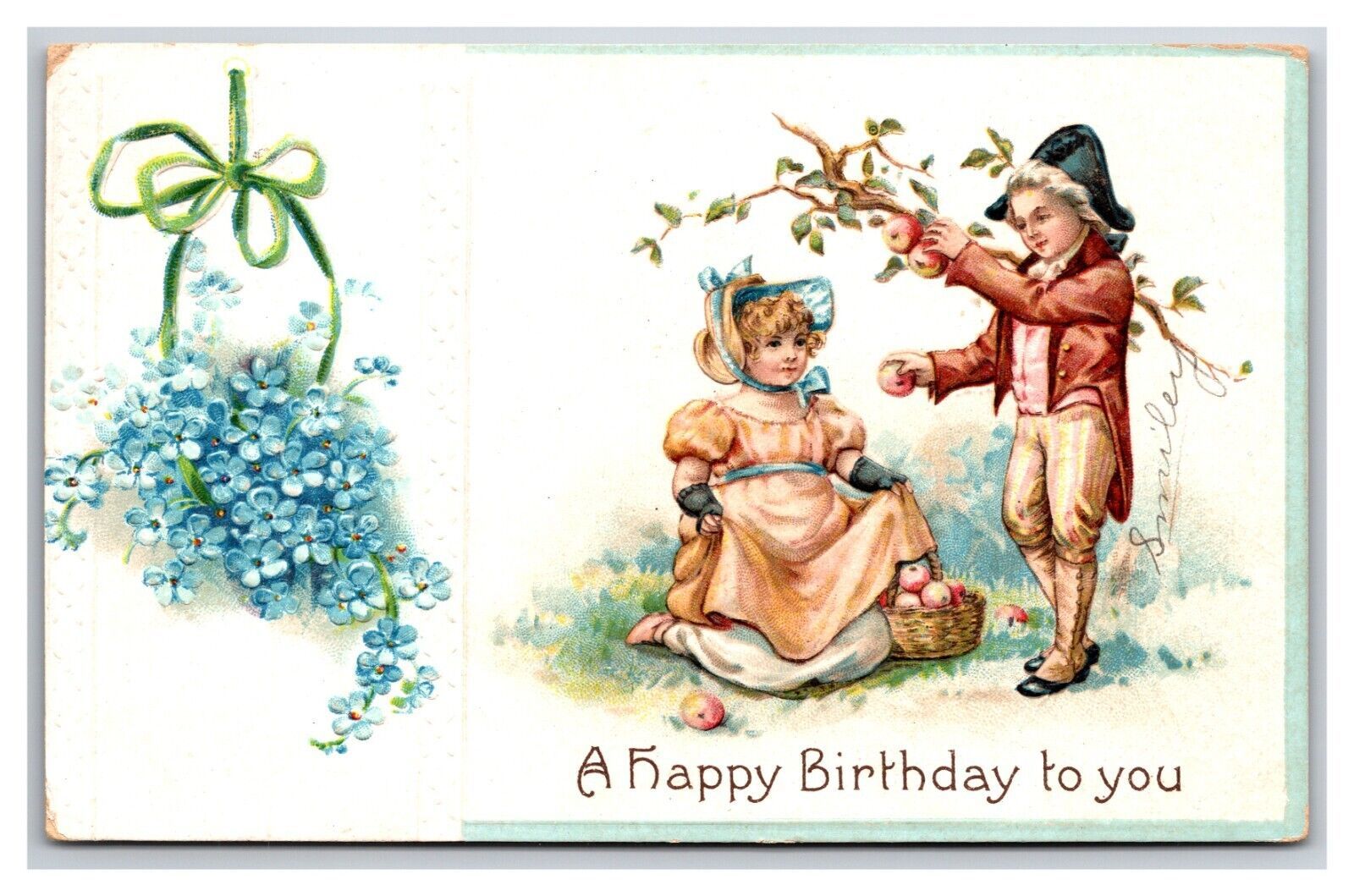 Boy and a Girl Apples Flowers Happy Birthday Embossed DB Postcard XB12