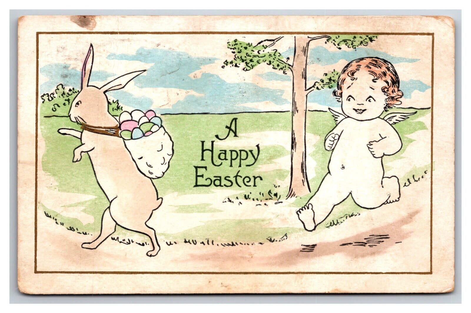 Easter Bunny and Cherub Running Happy Easter DB Postcard XB12