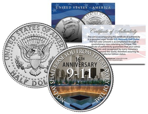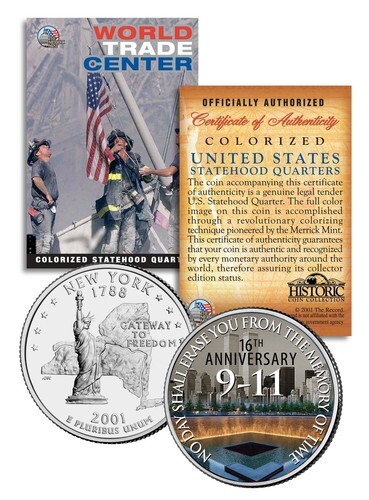 This WORLD TRADE CENTER ? SEPTEMBER 11TH ? 14TH ANNIVERSARY coin is a treasured collectible. Here is your opportunity to own or to gift, a beautifully colorized 2001 New York Statehood Quarter U.S. Coin, which has been enhanced with a beautiful colorized image by the Merrick Mint. Each coin comes in a premium coin capsule with a full color Certificate of Authenticity. This Legal Tender United States coin has been colorized with an application of special inks directly to the surface of the coin, using a unique and painstakingly multi-color coin process, which achieves a level of detail, color saturation, and durability that is #1 in the coin industry. The result is an everlasting colorized coin collectible of ultra-high quality. Each Statehood Quarter coin features an emblematic design of the New York state on the reverse and colorized image of ONE WORLD TRADE CENTER on the obverse (portrait of George Washington design).