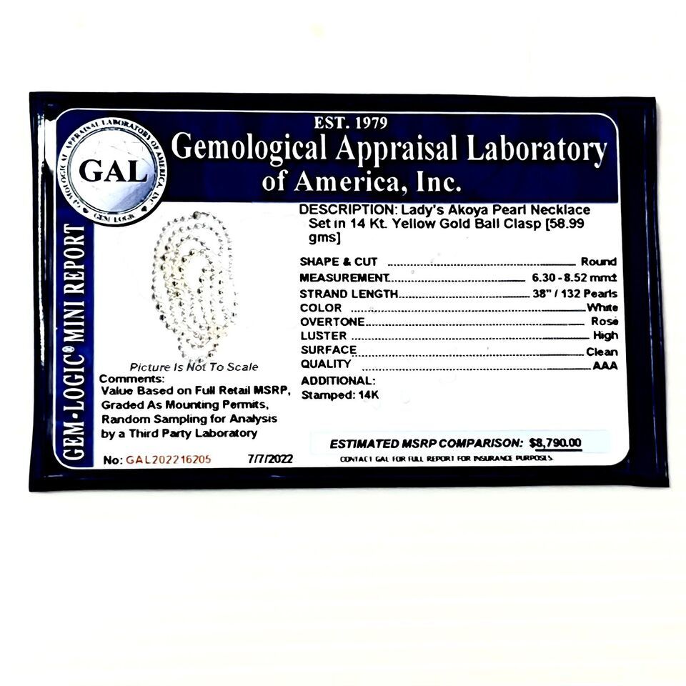This Akoya pearl necklace has been Certified, Inspected, and Appraised by Gemological Appraisal Laboratory