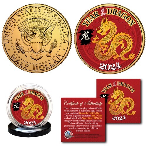 This high-quality Chinese Zodiac POLY-CHROME U.S. coin has been Gilded in Genuine 24 Karat Gold, and then enhanced with beautiful colorized images of the Chinese Zodiac using a unique painstaking exclusive multicolor authentic process. Each coin comes in a premium coin capsule with a matching Certificate of Authenticity to guarantee that your coin is authentic and recognized by every monetary authority around the world, assuring its Collector Edition status.