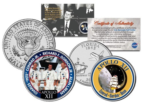 This APOLLO 11 "50th Anniversary" complete 2-coin set is a treasured collectible. Here is your chance to own beautifully colorized JFK Kennedy Half Dollar U.S. Coins. This Apollo 11 2-coin set commemorates the 50th anniversary of the first human landing on the moon. On July 20, 1969, after the Apollo 1 tragedy and series of successful tests in Earth and lunar orbit, Apollo 11 astronauts Neil Armstrong and Buzz Aldrin guided their Eagle lander to Tranquility Base on the surface of the moon while crewmate Michael Collins circled above inside the command module Columbia. The Apollo missions were the answer to a challenge issued by President John F. Kennedy to put a man on the moon. The landing marked success for the U.S. over the Soviet Union, and has since been billed as the Space Race. This remains among NASA's pinnacle achievement since its inception. Each coin comes in a premium coin capsule. The set comes with a Certificate of Authenticity to guarantee that your coins are authentic and recognized by every monetary authority around the world, assuring its Collector Edition status.