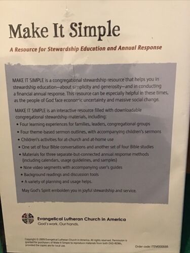 The DVD format makes it easy to view and understand the material, and it is a great addition to any collection of religious educational resources. The publication name, "Make It Simple Stewardship Education Annual Response," reflects the DVD's focus on making stewardship education accessible and easy to understand. This DVD was manufactured in the United States and is an excellent resource for anyone interested in learning more about the Evangelical Lutheran Church's teachings on stewardship.