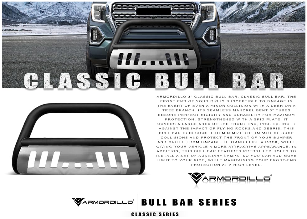 Armordillo 3" Classic Bull Bar. The Armordillo bull bar leaves nothing to be desired if you?re looking for top-quality grille guard. Its seamless mandrel bent 3" tubes ensure perfect rigidity and durability for maximum protection. Strengthened with a skid plate, it covers a large area of the front end, protecting it against the impact of flying rocks and debris.