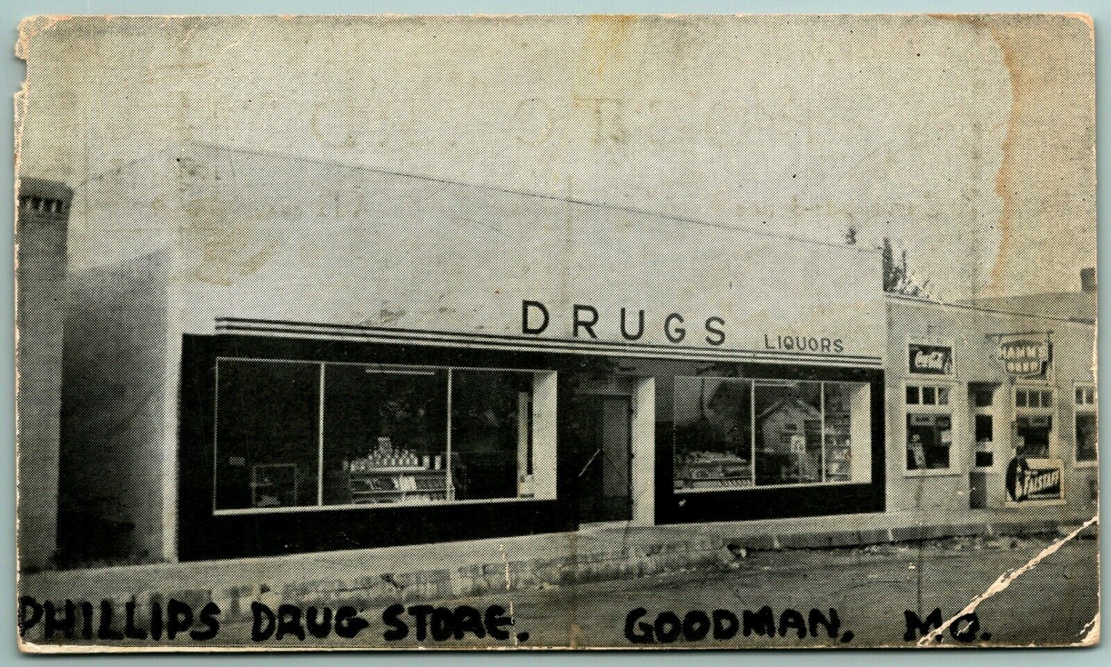 Phillips Drug Store Coca Cola Sign Goodman MO Missouri B W DB Postcard D14