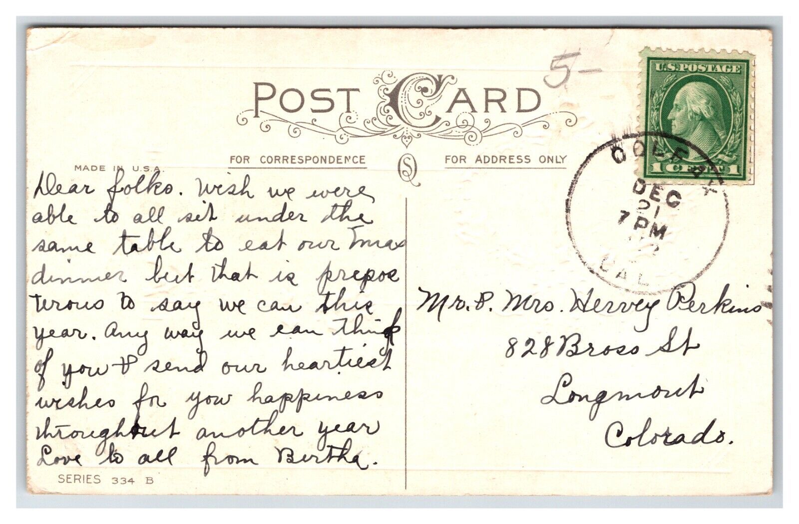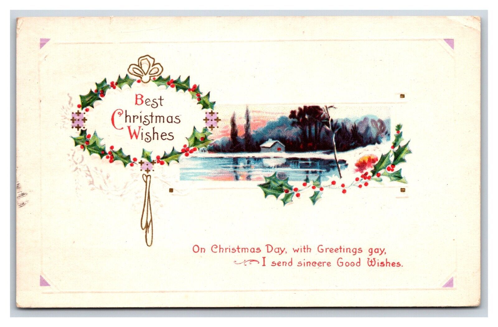 Best Christmas Wishes Cabin Scene Holly Wreath Embossed DB Postcard R10
