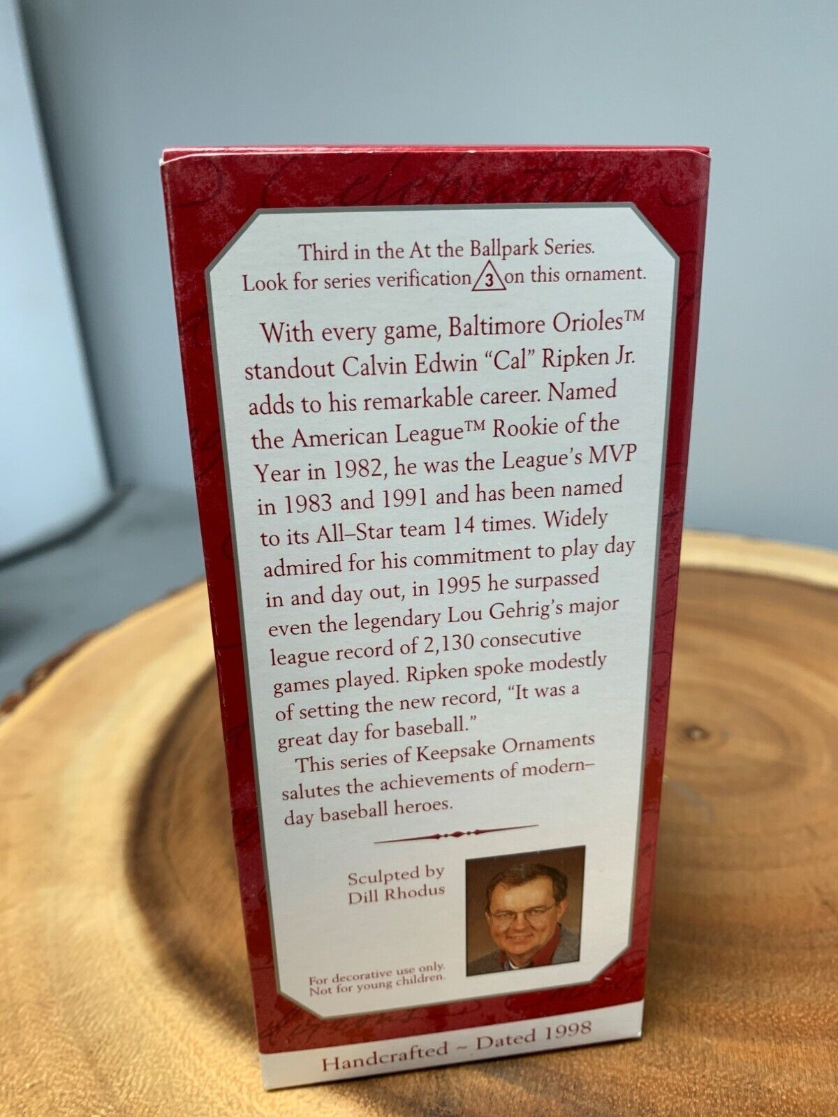 baseball ornament, Cal Ripken, collector series, keepsake ornament, Hallmark ornament, sports memorabilia, baseball figurine, Baltimore Orioles, 1998 ornament, MLB collectibles, Cal Ripken Jr., vintage ornament, holiday decor