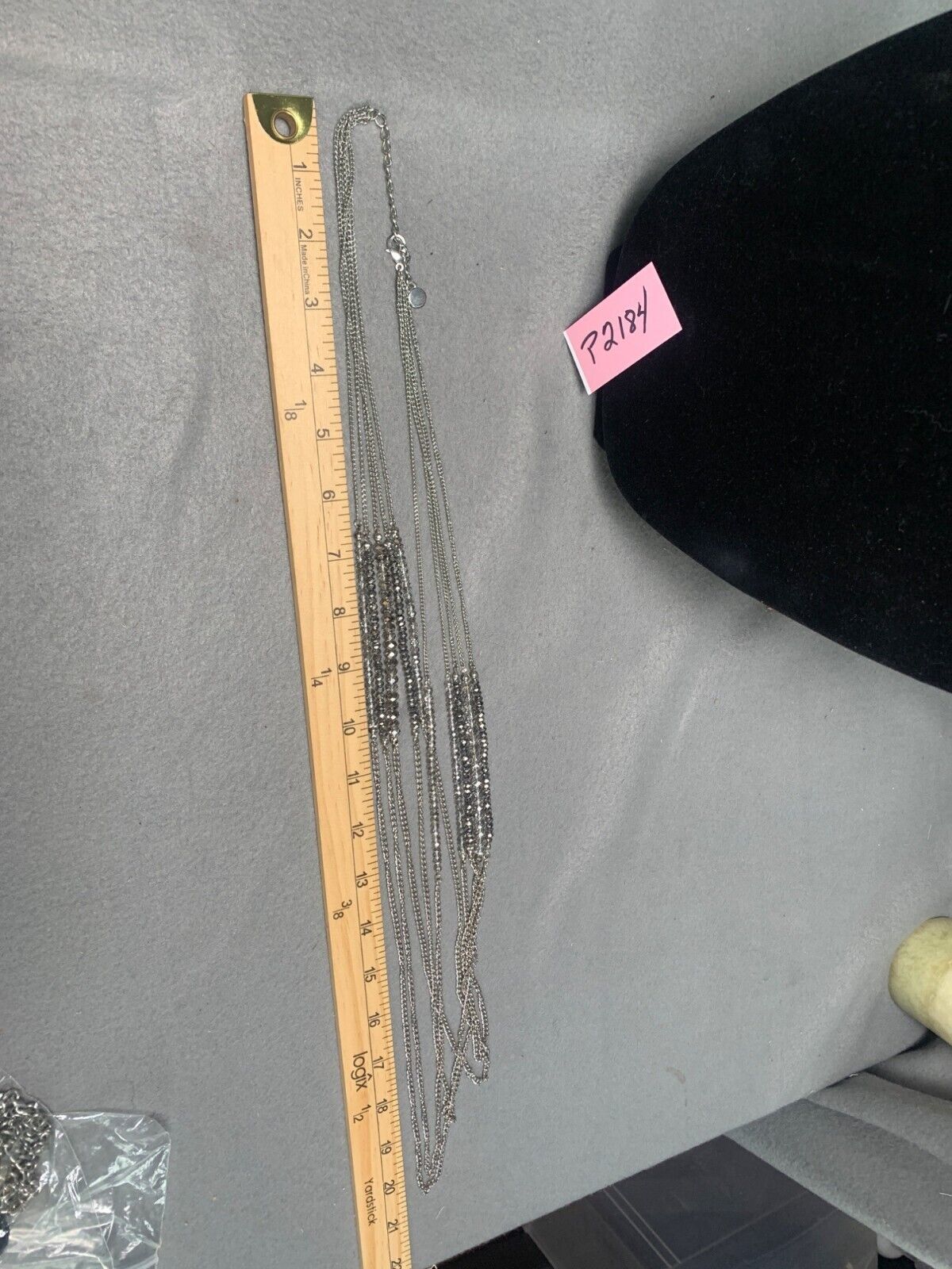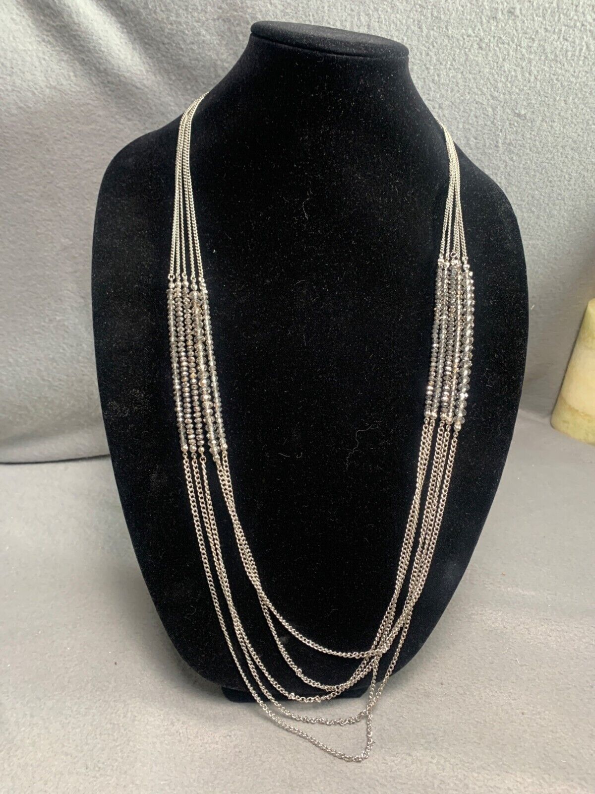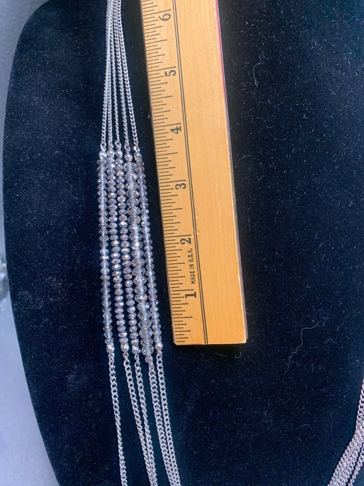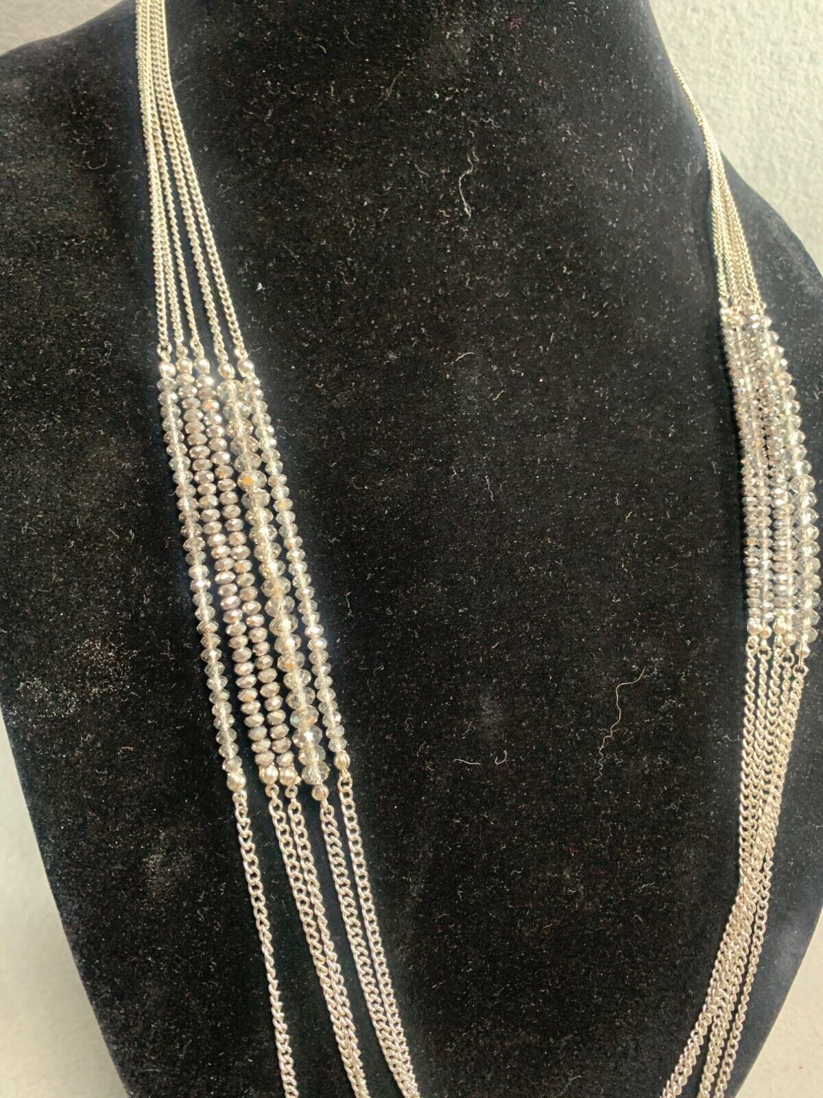This exquisite necklace showcases an elegant multi-strand design featuring shimmering silver chains complemented by delicate beaded accents. Its sophisticated style adds a touch of glamour to any outfit, suitable for both formal and casual occasions. With its 40-inch length, it offers versatility and ease in layering, enhancing your style effortlessly.