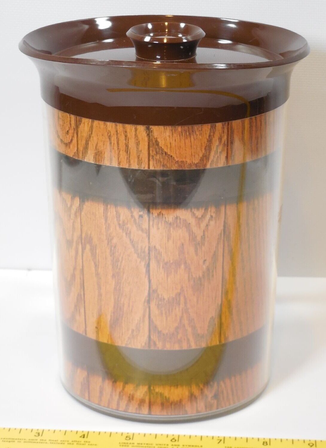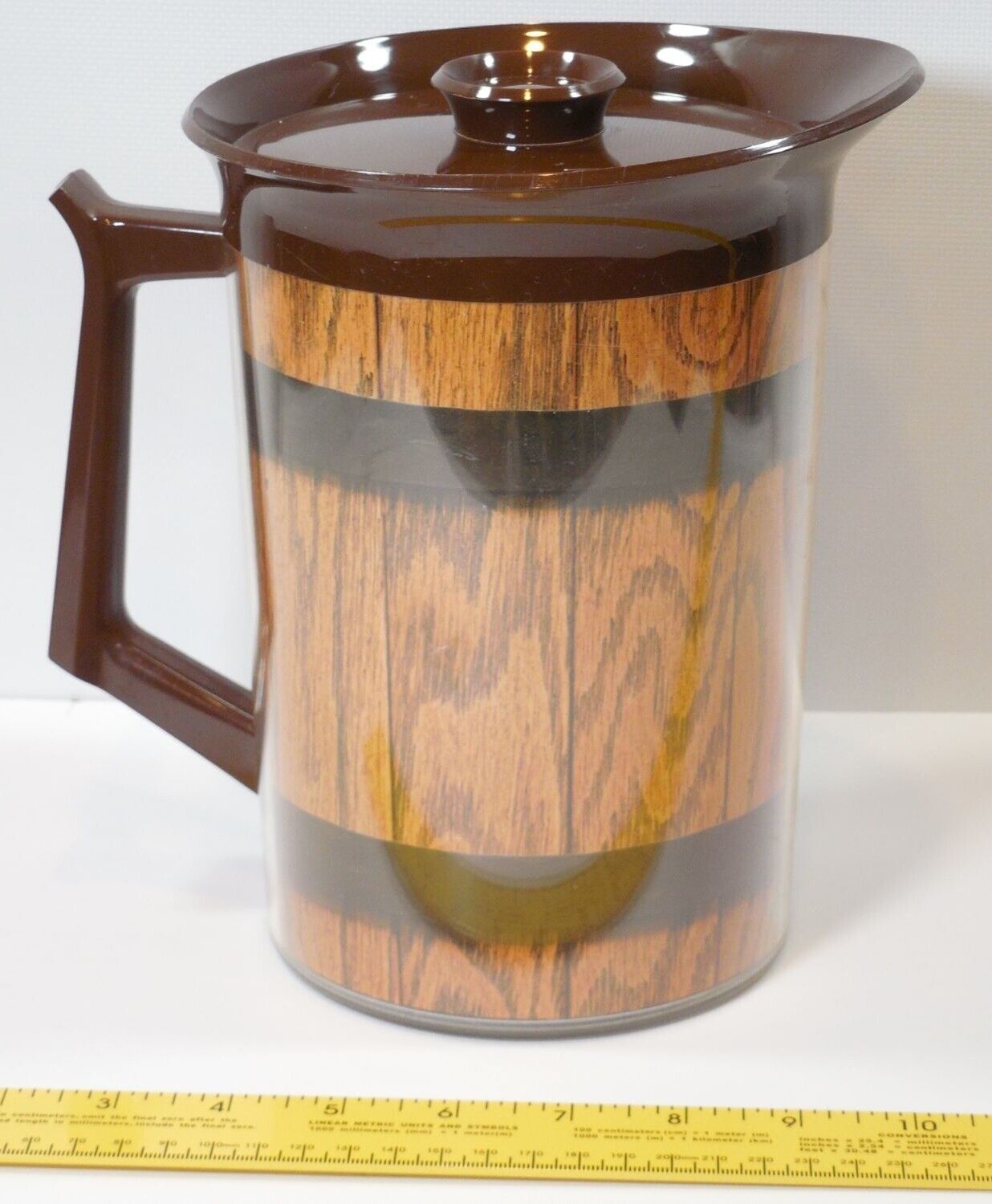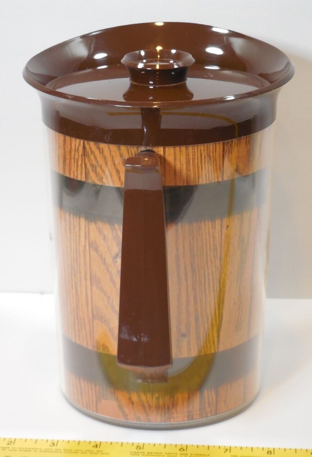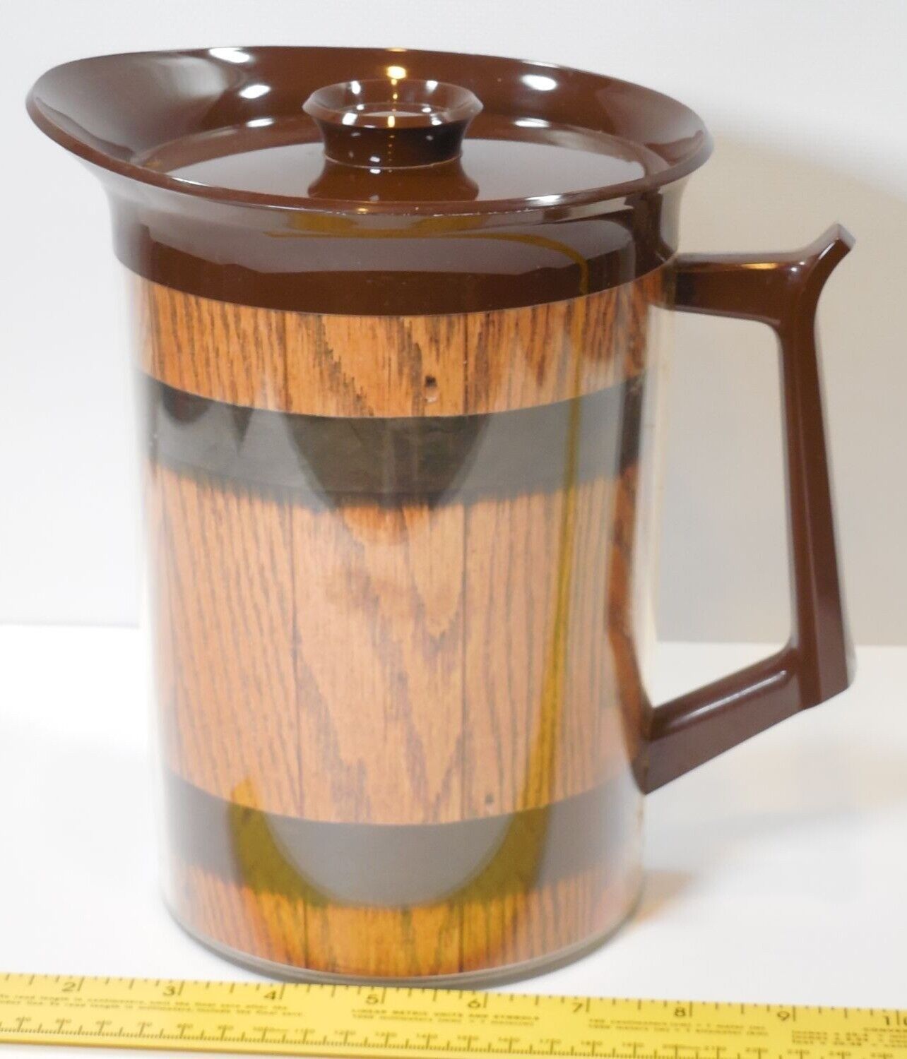 Vintage Thermo Serv Coffee Carafe Pitcher in a classy wood grain design. Made in the USA, this 55oz pitcher is crafted from durable plastic in a rich brown color.
