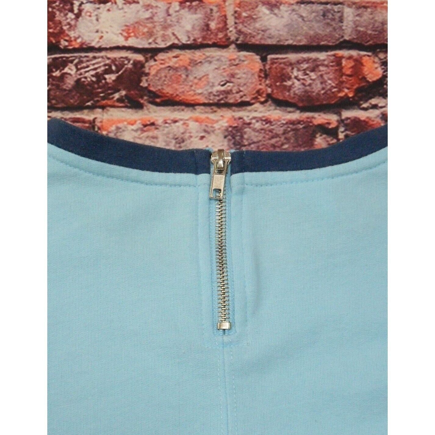 Adorned with whimsical Alice in Wonderland graphics, this shirt features blue and navy stripes on the sleeves and a zip back for easy wear.
