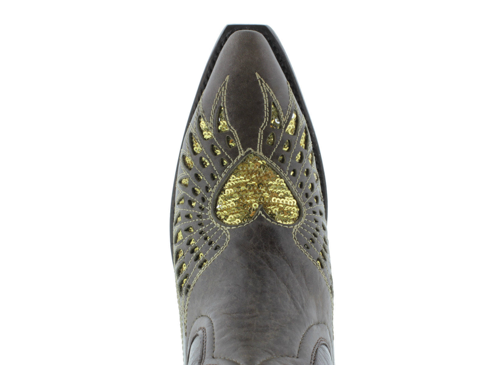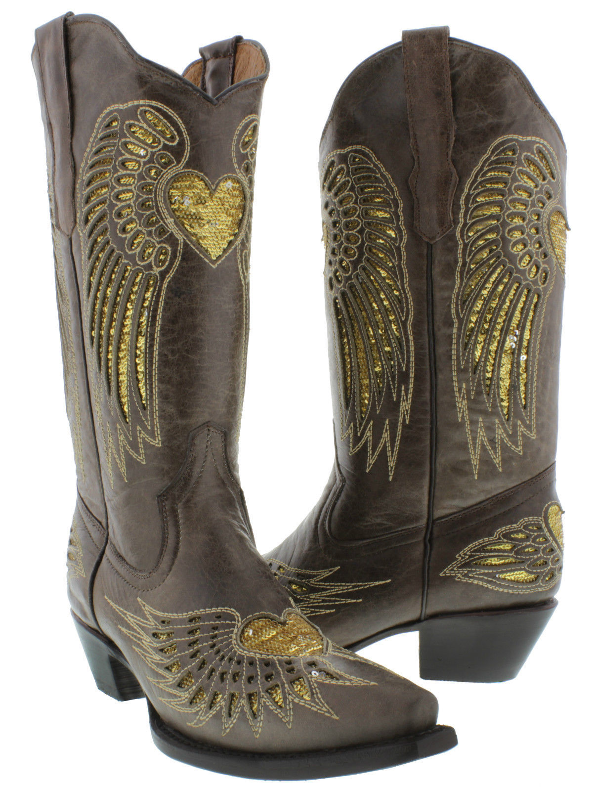 Womens Western Boot Cowboy Brown Leather Gold Sequins Heart Wings Size 5.5,6,9.5
