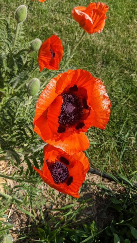 Huge, bright scarlet-orange flowers feature black blotches at the base of each petal. Plants bloom profusely in May and June from the year after the seed is sown.