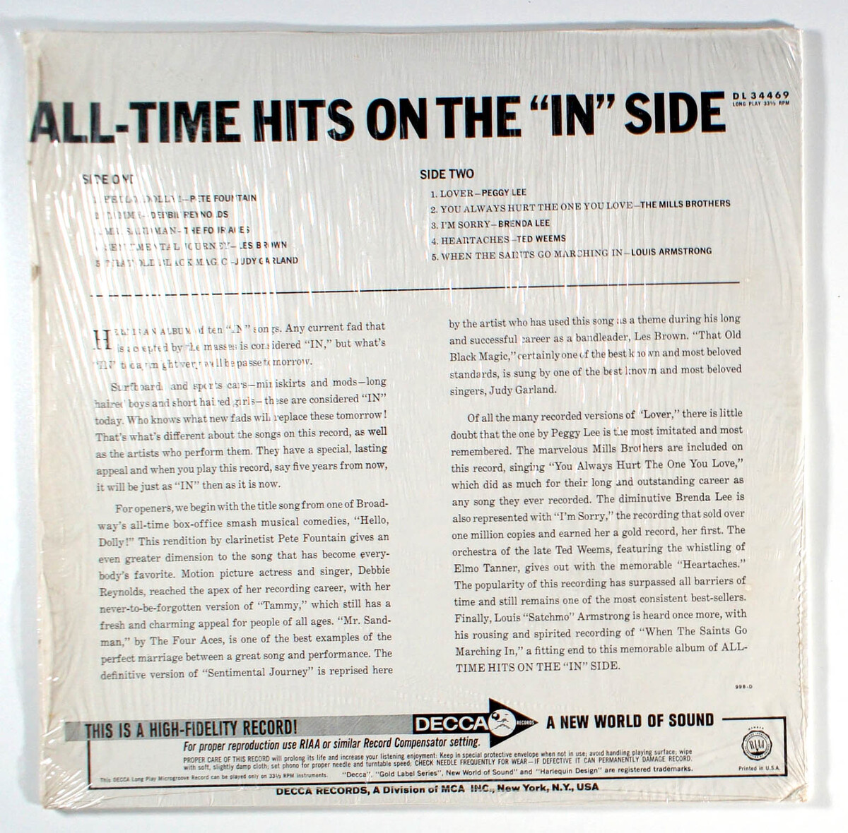 All-Time Hits in the "In" Side is a compilation featuring popular tracks from various artists, reflecting the vibrant music scene of the late 1950s and early 1960s. While specific tracklists for this album are less documented, Decca's 1960 releases often included hits from artists like Brenda Lee and Buddy Holly, who recorded for Decca or its subsidiaries. The album's historical significance lies in its representation of Decca's strategy to capitalize on the era's pop and rock 'n' roll boom, showcasing the label's diverse roster during a transformative period in music. No specific hit singles are directly tied to this compilation, as it likely featured previously released tracks rather than new singles. Its release aligns with Decca's prominence in the 1960s, a decade when the label rivaled EMI in the UK and supported acts like The Rolling Stones.