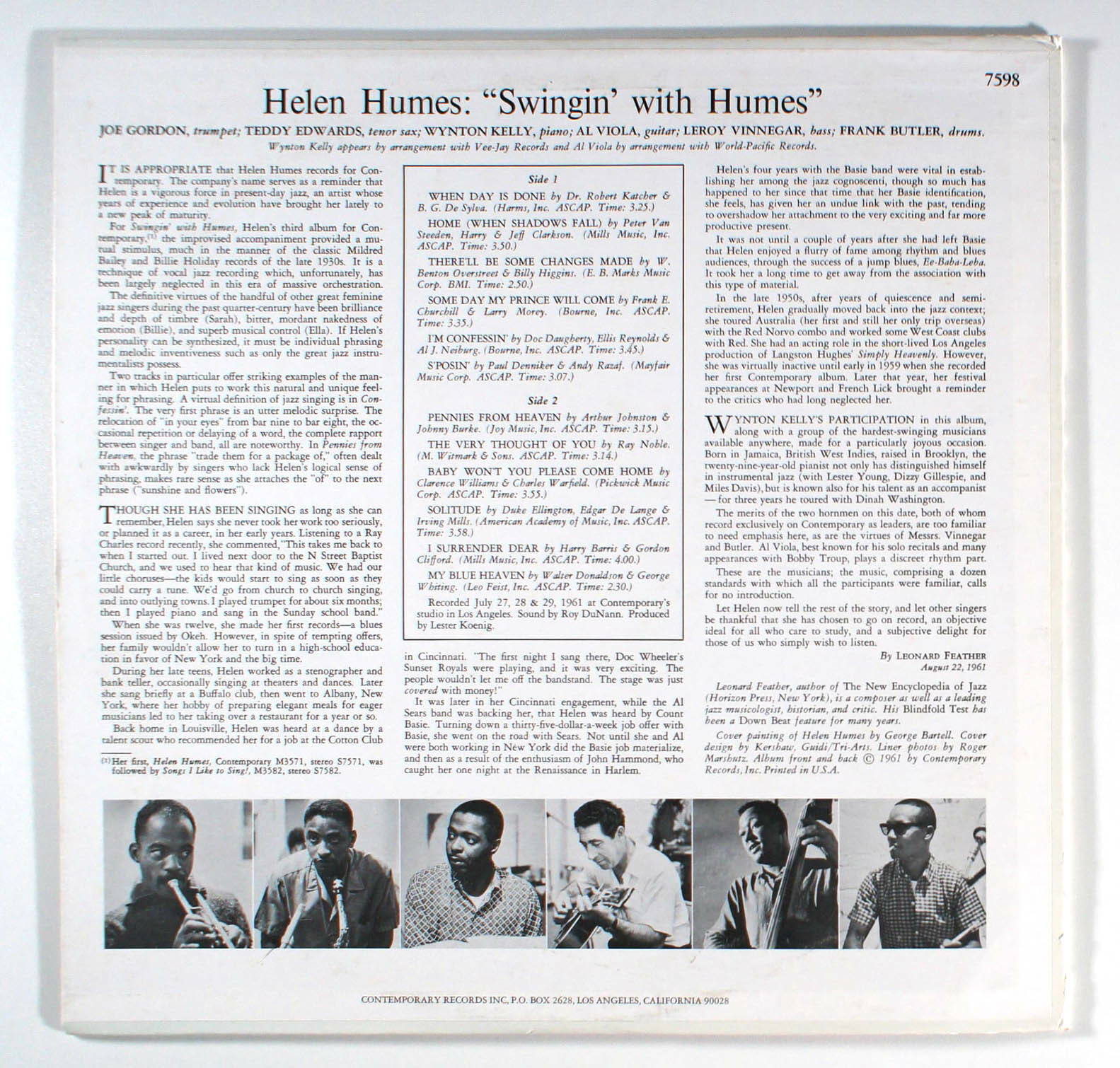 Swingin' With, by Helen Humes, is the third of three memorable Contemporary releases featuring, according to Scott Yarrow, Allmusic contributor, the distinctive singer on a dozen standards that she had missed documenting thus far. With fine backup work by trumpeter Joe Gordon, tenor saxophonist Teddy Edwards, pianist Wynton Kelly, guitarist Al Viola, bassist Leroy Vinnegar and drummer Frank Butler, Humes is in top form on such tunes as When Day Is Done, There'll Be Some Changes Made, Pennies From Heaven and The Very Thought of You. One of her better albums."