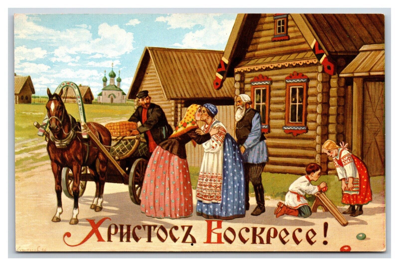 Village Scene Христос Воскресе Happy Easter Serbian UNP Chrome Postcard I20